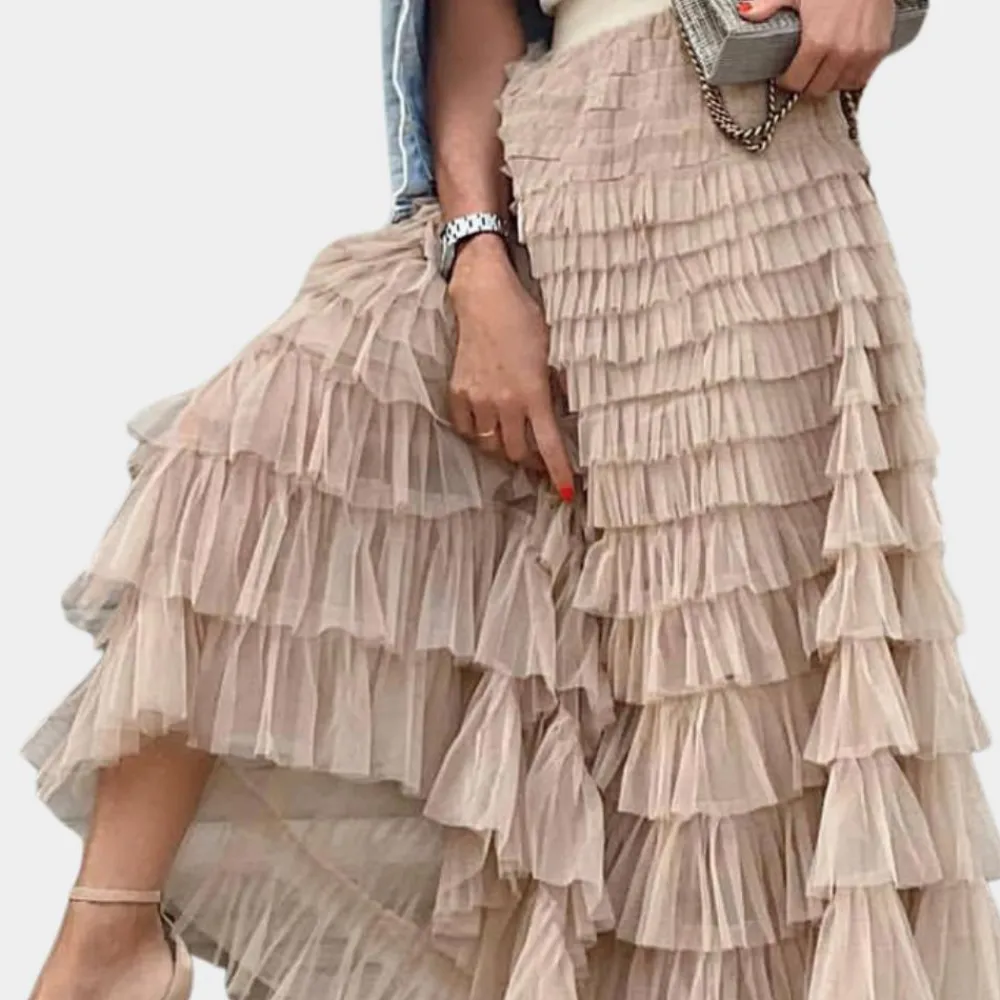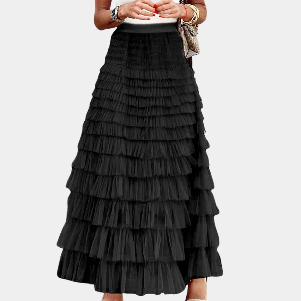 De Shay Stijlvolle damesrok van netstof belichaamt de perfecte mix van elegantie en speelsheid. Met zijn hoge taille en prachtige plooien creëert de rok een betoverende baljurk die er perfect uitziet voor alle gelegenheden. Of je nu een romantische date hebt of een avondje uit met je vrienden, deze rok geeft je outfit een vleugje glamour.