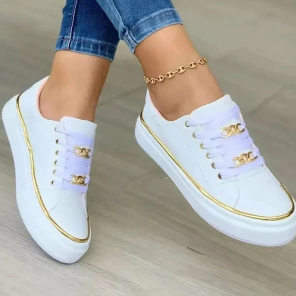 De sneakers zijn gevoerd met een gouden rand en hebben een prachtig gouden kettingdetail op de veter, wat een extra vleugje elegantie toevoegt.