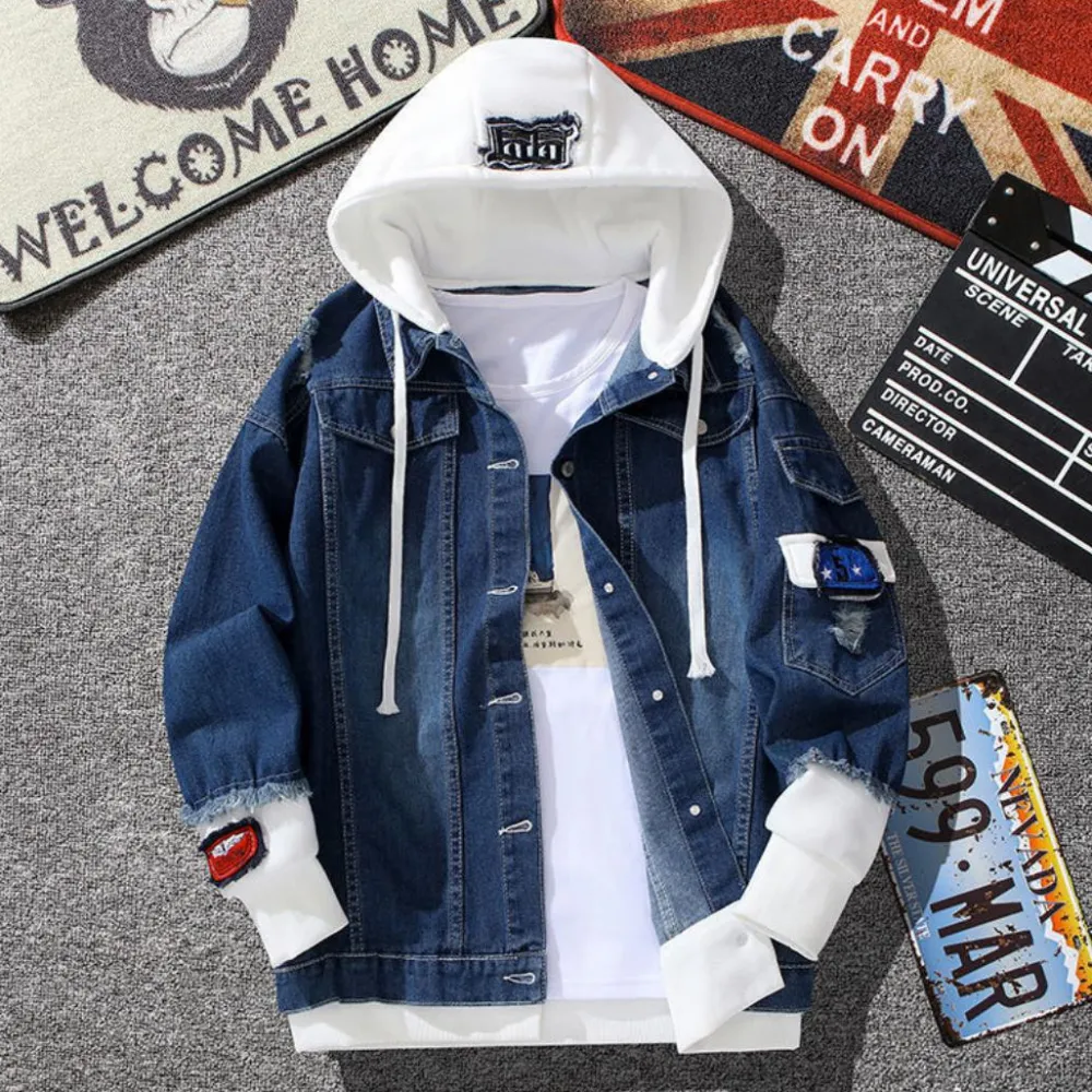 Stijlvol denim herenjack van gemĂȘleerde stoffen.