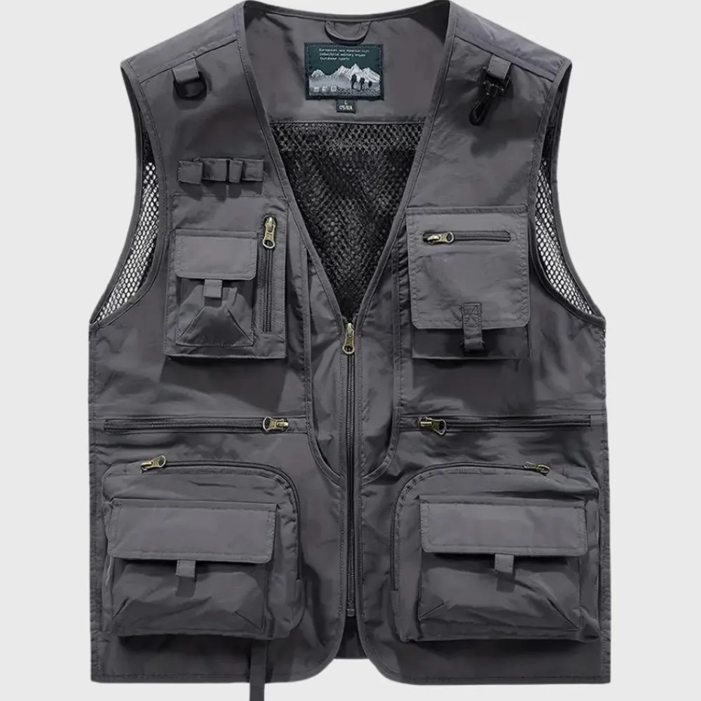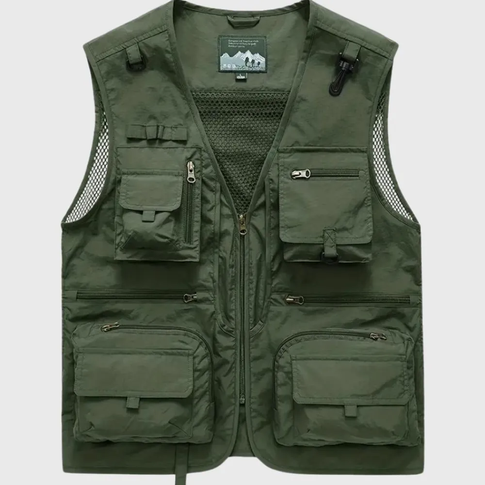Hier heb je onze Troels Ademend cargo herenvest met meerdere zakken. Deze vest is zowel comfortabel als stijlvol voor uitgaan, maar ook voor thuis op de bank. Deze vest is gemaakt van een comfortabele stof die geschikt is voor de lente, herfst en winter.