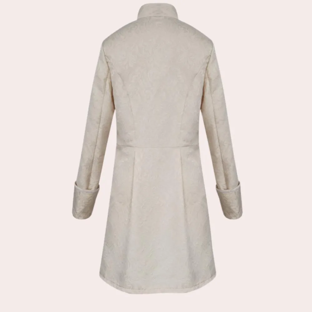 - Unieke ridderstijl: Het Yiannis jasje heeft een lange, dramatische snit die geïnspireerd is op de riddermode, wat zorgt voor een opvallende en onderscheidende uitstraling.
