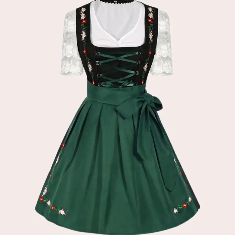 Stap in de Oktoberfest-sfeer met deze prachtig traditionele jurk. De outfit bevat een opvallende donkergroene rok en een zwart lijfje, versierd met prachtige bloemenborduursels. De kanten mouwen voegen een vleugje verfijning toe, terwijl het korsetachtige rijgsysteem aan de voorkant de klassieke Beierse charme benadrukt.