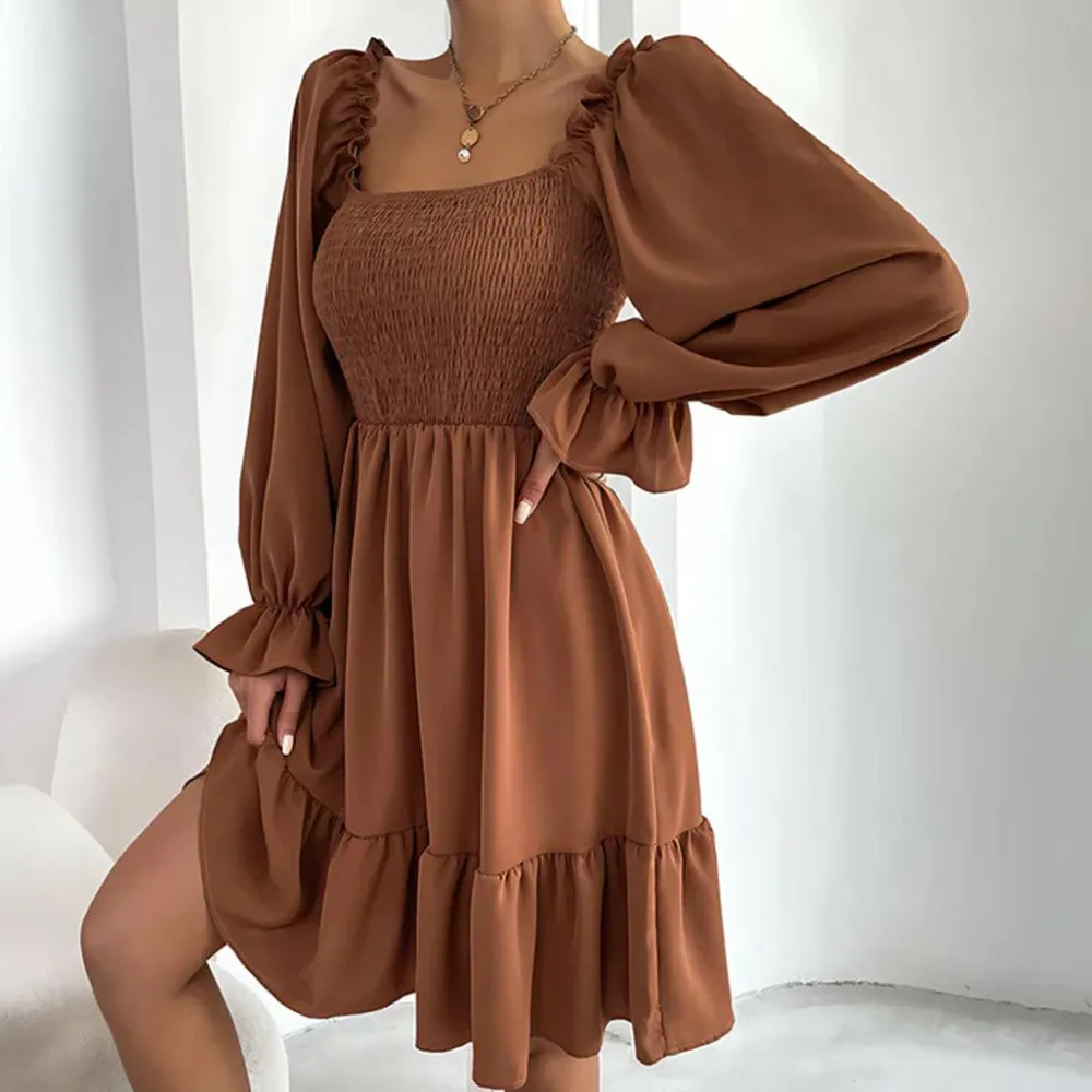 De vierkante diepe halslijn voegt een vleugje verfijning toe, terwijl de lengte boven de knie een flirterige en jeugdige look geeft. De lange mouwen met ruches rond de polsen voegen een vleugje speelsheid en elegantie toe. De aansluitende bovenkant van de jurk benadrukt je rondingen, terwijl de losse en zwierige onderkant zorgt voor bewegingsvrijheid. Of je nu een dagelijkse gelegenheid bijwoont of een romantisch diner hebt, met deze jurk zie je er moeiteloos stijlvol uit en straal je vrouwelijke allure uit.