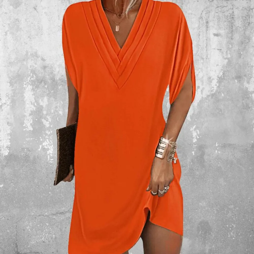 Voel de zachte omarming van de V-halskraag, een subtiel detail dat precies de juiste hoeveelheid charme toevoegt. De mouwen met split zijn een speels accent dat de jurk een unieke uitstraling geeft. Of je nu een casual dag hebt of een speciale gelegenheid, deze jurk past zich moeiteloos aan jouw stijl aan.