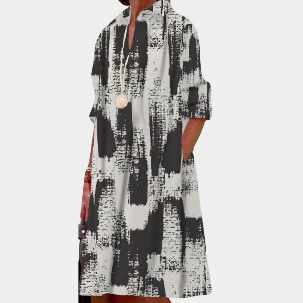 Casual bedrukte damesjurk is ontworpen om het vrouwelijke lichaam te flatteren. Hij is gemaakt van hoogwaardige stoffen die comfortabel zijn en het figuur accentueren. De blousejurk is verkrijgbaar in verschillende kleuren en maten.