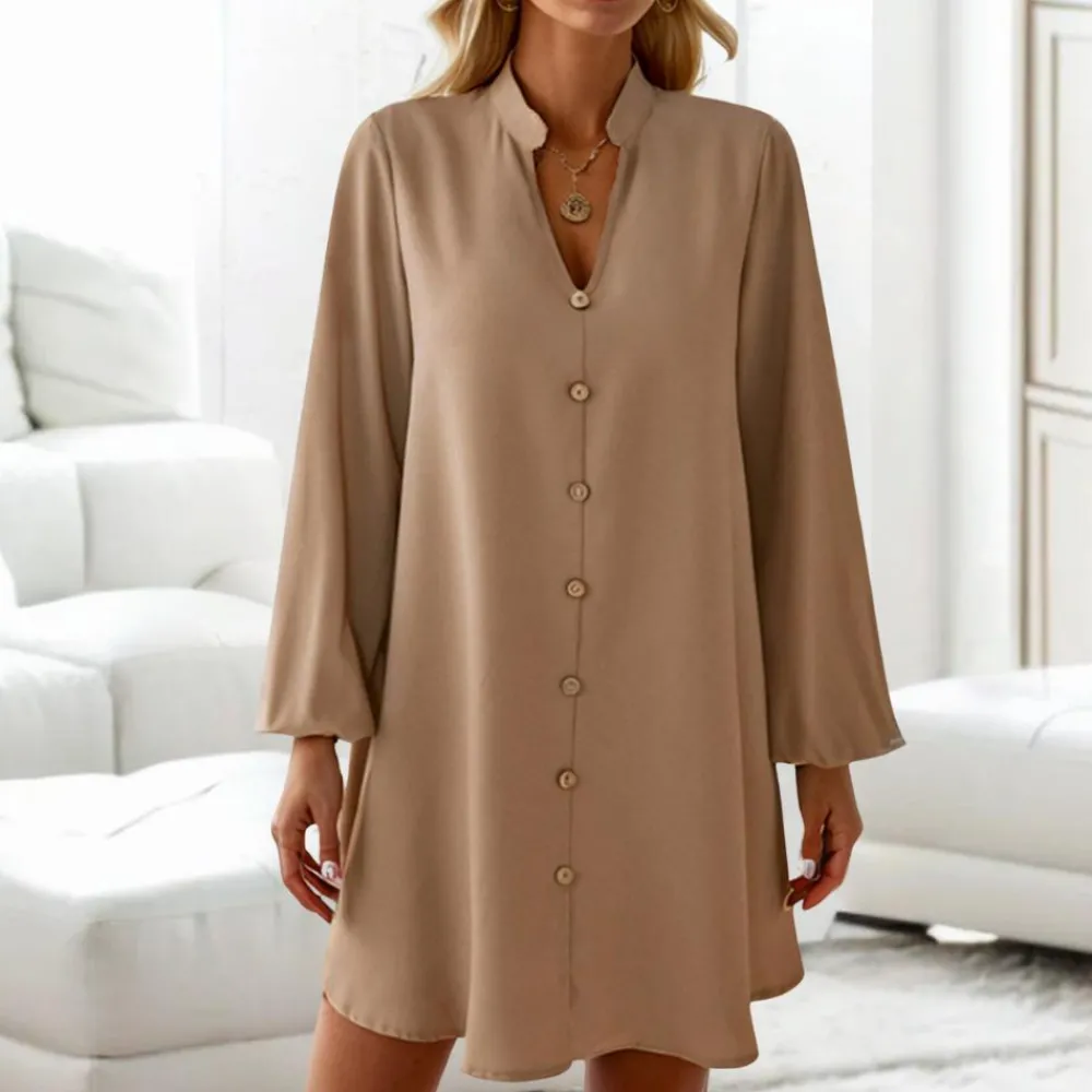 Verhoog je seizoensstijl moeiteloos met onze effen jurk met V-hals die staat voor ingetogen elegantie.