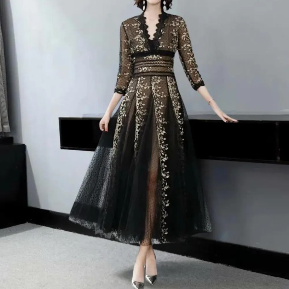 Verlies jezelf in de verfijning van het flatterende silhouet en geniet van de luxe van hoogwaardige stoffen. Verhoog moeiteloos je stijl met Eleanora – een elegante kanten jurk met v-hals voor dames.