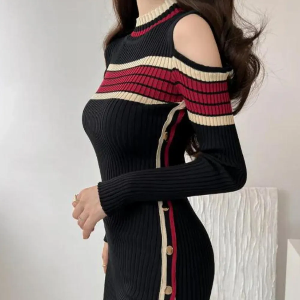 Deze moderne jurk heeft een verfijnd ontwerp met blote schouders, wat een edgy touch aan je outfit toevoegt en tegelijkertijd je silhouet elegant accentueert. Gemaakt van zachte, rekbare stof, biedt deze jurk zowel warmte als flexibiliteit, waardoor het perfect is voor jaarrond gebruik.