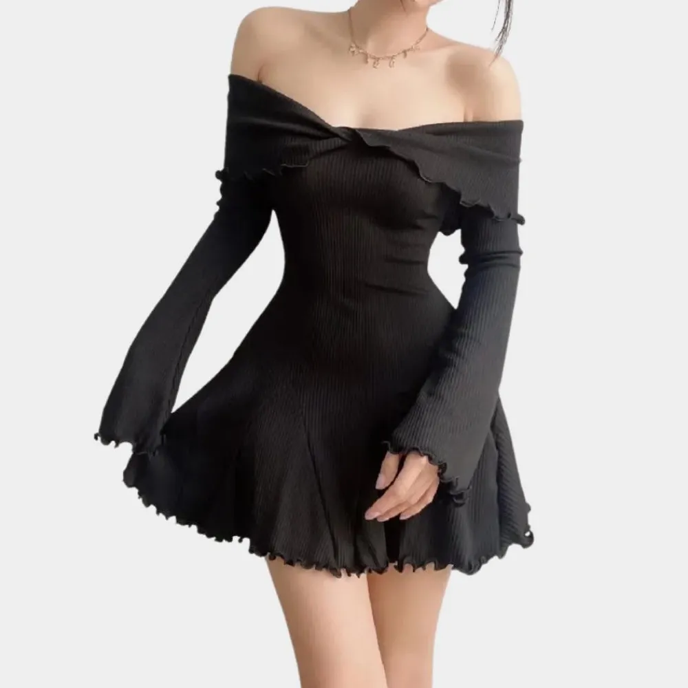 Onze Joelene Gebreide damesjurk met off shoulder heeft een prachtige vorm die je rondingen zal flatteren en je een vrouwelijke uitstraling zal geven.