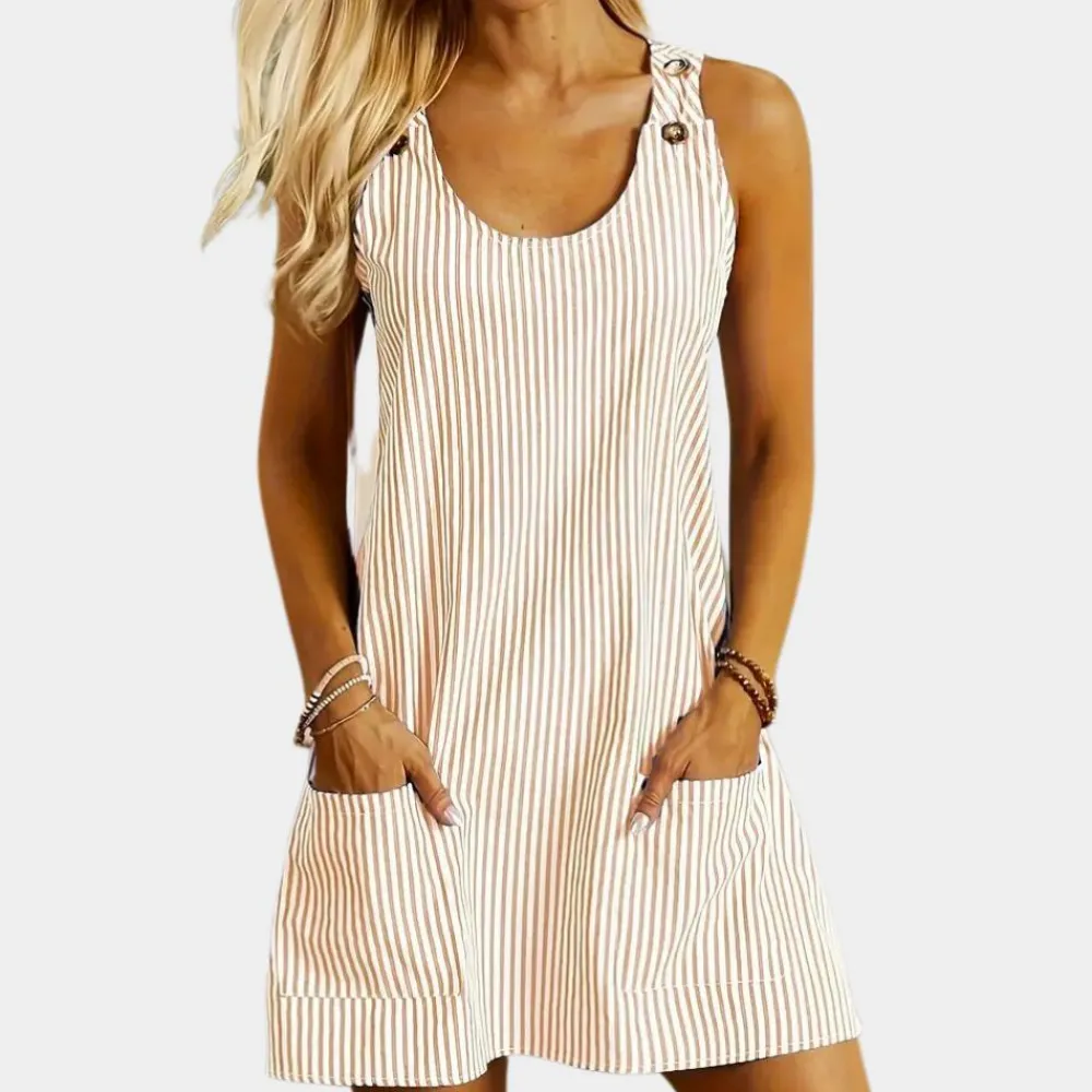 De Modieuze gestreepte damesjurk is zorgvuldig vervaardigd uit hoogwaardige materialen om duurzaamheid en comfort te garanderen. Met zijn slanke pasvorm combineert deze jurk moeiteloos verfijning met alledaags gemak. Het tijdloze streeppatroon voegt een vleugje elegantie toe aan elk ensemble, terwijl de praktische zakken gemak bieden zonder stijl op te offeren. Upgrade je garderobe met dit veelzijdige stuk dat perfect is voor zowel werk als casual activiteiten.