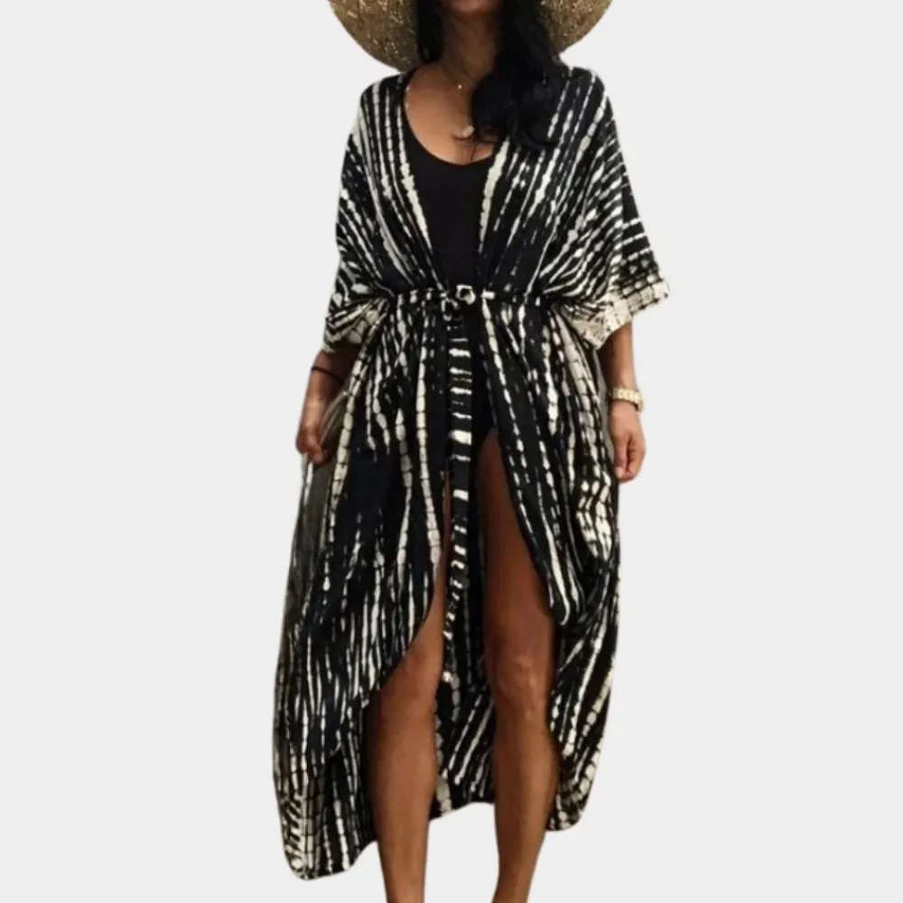 Onze oversized kimono met een helder batikpatroon is gemaakt van eersteklas stof met natuurlijke vezels voor ultiem ademend vermogen en comfort. De kimono wordt geleverd met een riem en biedt verschillende stylingopties. Combineer hem met je favoriete jeans en een topje voor een casual flair, drapeer hem als luxe kamerjas of draag hem als elegante badjas voor op het strand.