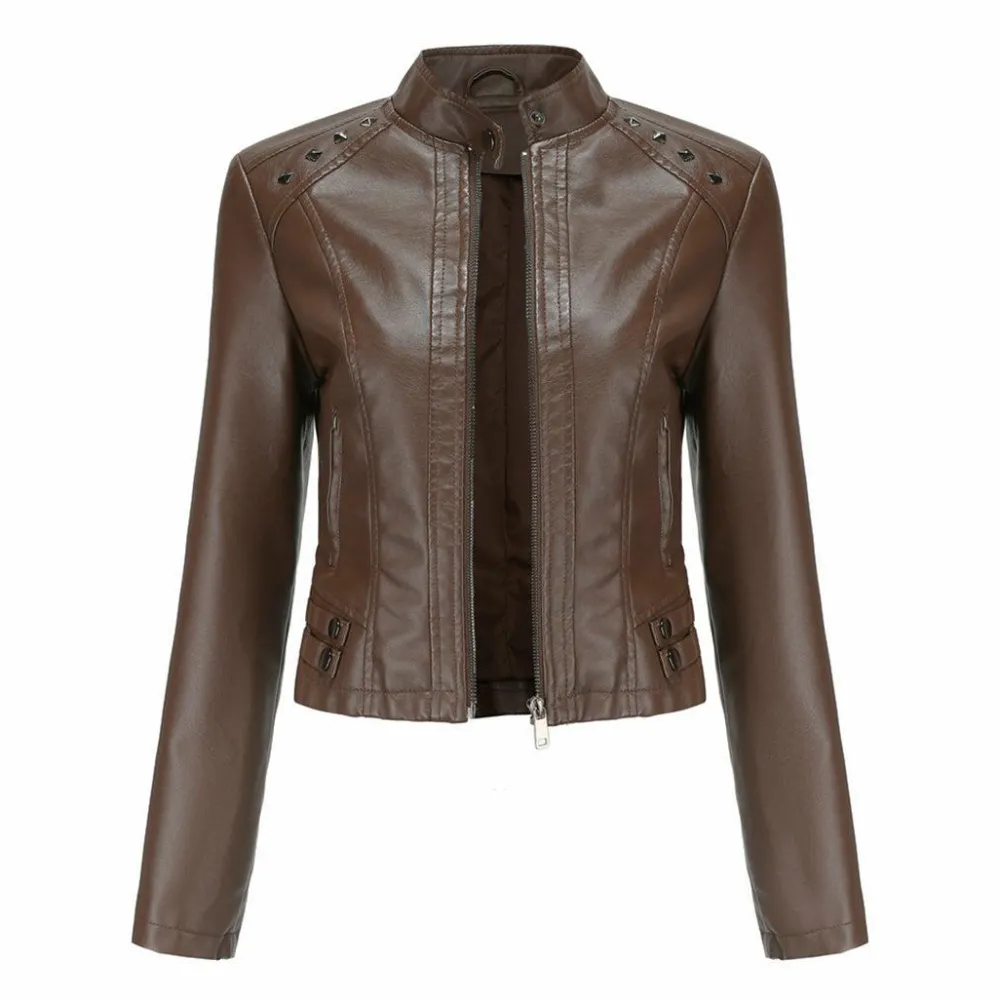 De jas heeft een symmetrische rits en een chique opstaande kraag met een knoop, en decoratieve klinknagels op de schouder, die er vooral stijlvol uitzien als ze open worden gedragen. Het heeft twee zijhandzakken met rits die voldoende ruimte bieden voor uw handen, sleutels en andere kleine voorwerpen.
