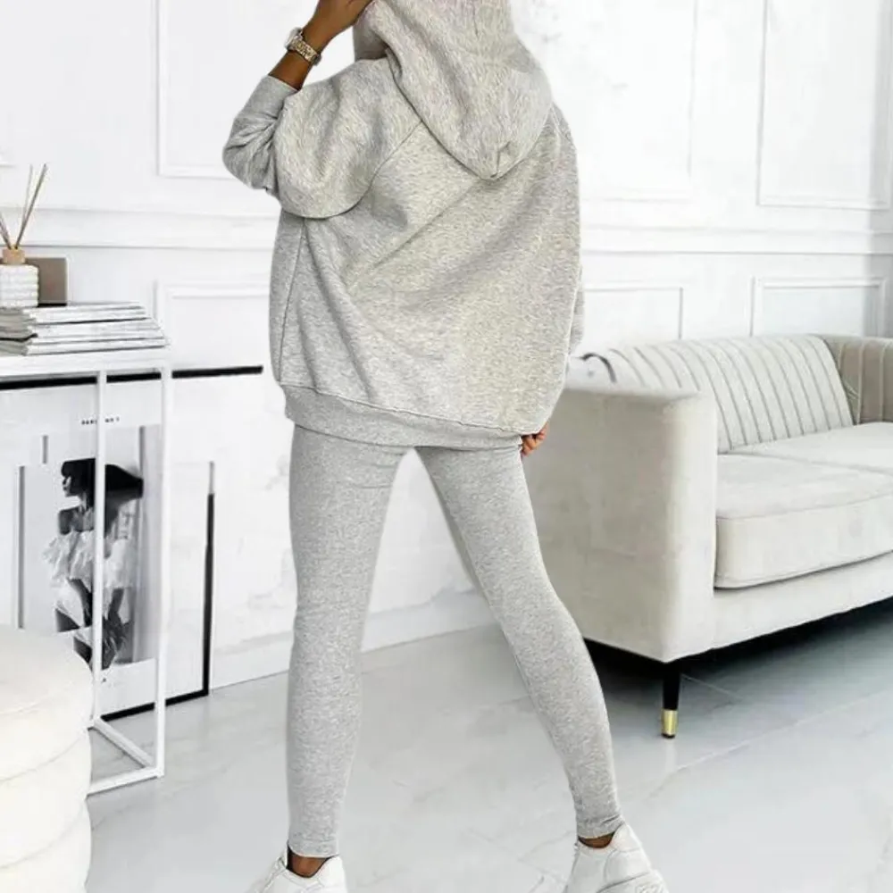 Het ensemble bestaat uit een geribde top, een oversized hoodie en een geribde legging met een hoge taille, die samen of apart een fantastische indruk maken.