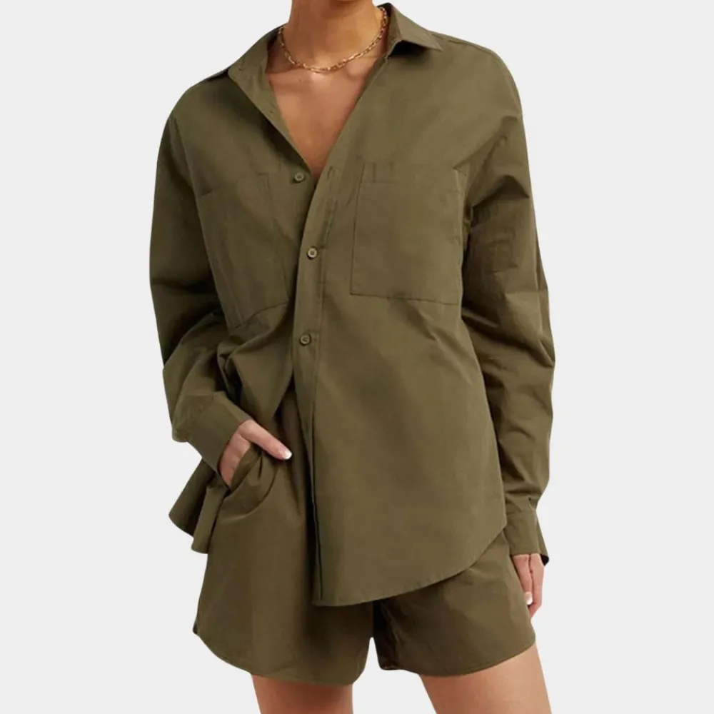 Ervaar de tijdloze verfijning van Casual driedelige damesset, een elegante driedelige set bestaande uit een stijlvolle short, een luchtige top en een luchtige blouse. Dit ensemble is gemaakt van hoogwaardig polyester en biedt zowel comfort als stijl.