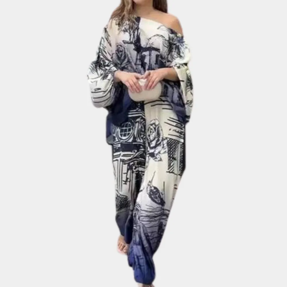Deze set wordt gekenmerkt door een verfijnde blauwe print die subtiel opvalt en tegelijkertijd een statement maakt. Met de perfecte balans tussen speelsheid en verfijning is deze set een must-have voor je garderobe.