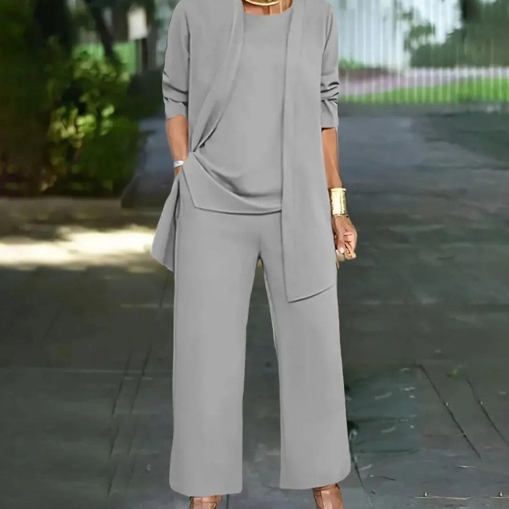 - Comfort en stijl: De set bestaat uit een elegante top, een bijpassende broek en een vest, die je de hele dag door comfortabel en modieus houden.