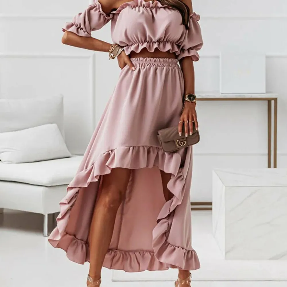 Elastische schouderhalslijn en hooggesloten rok met ruches