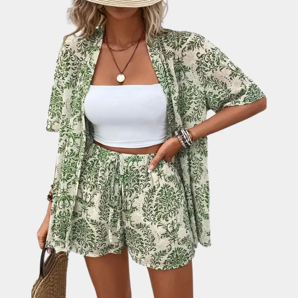 De Guiliana groene zomerset voor dames met blouse en korte broek met print is precies wat je nodig hebt. Deze 2-delige zomer set voor dames combineert stijl en comfort, ideaal voor elke zomerse dag.
