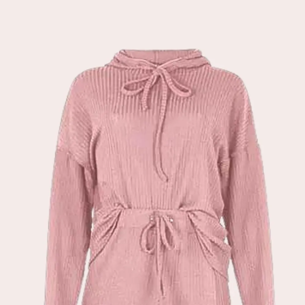 Deze loungeset biedt de perfecte mix van comfort en stijl. Met charmante koorddetails bij de halslijn en een bijpassende broek met wijde pijpen, combineert deze set casual elegantie met ontspannen gemak. De stof biedt comfort zonder stijl op te offeren, waardoor het de perfecte aanvulling is op elk ensemble.