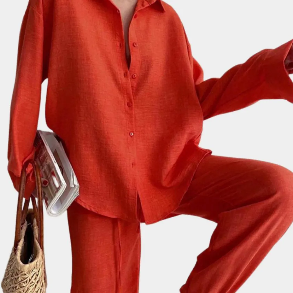 De Nera comfortabele tweedelige dames set met lange blazer en broek is de perfecte keuze. Beschikbaar in de kleuren beige, oranje en roze, combineert deze stijl en comfort voor elke gelegenheid.