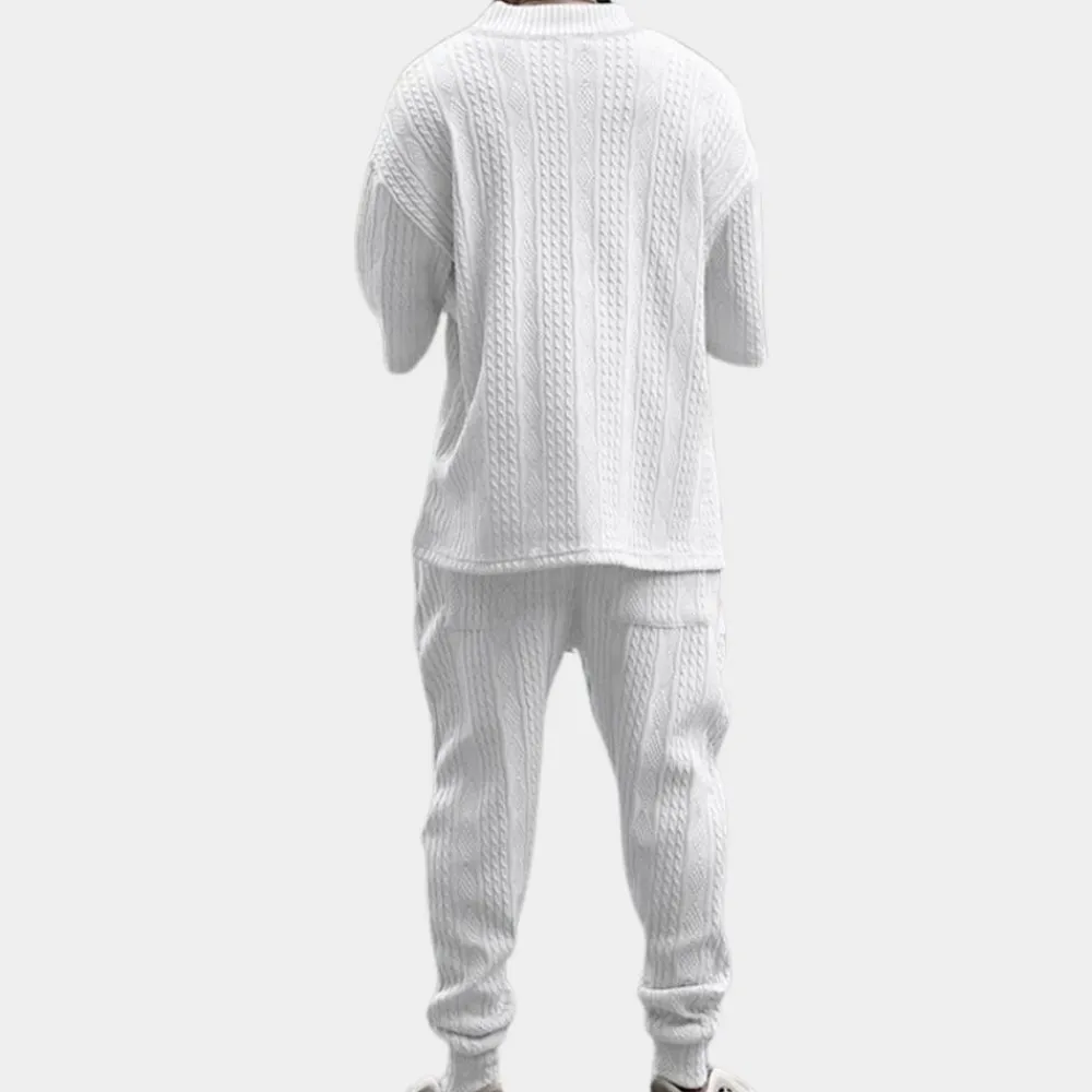 Maak je garderobe compleet met onze tweedelige gebreide herenset. De Duran Gebreide herenset tweedelig combineert naadloos met joggers met trekkoord, compleet met handige zakken. Combineer met sneakers voor een trendy look.