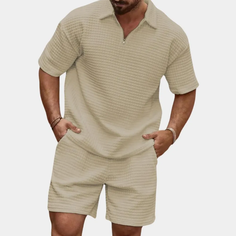 Onze set is een kunstwerk van smaak en functionaliteit, perfect voor de moderne man die op zoek is naar een vleugje verfijning in zijn dagelijks leven. Het geribbelde dessin geeft het overhemd een unieke charme, terwijl de bijpassende short de look compleet maakt en u een onderscheidende uitstraling garandeert.
