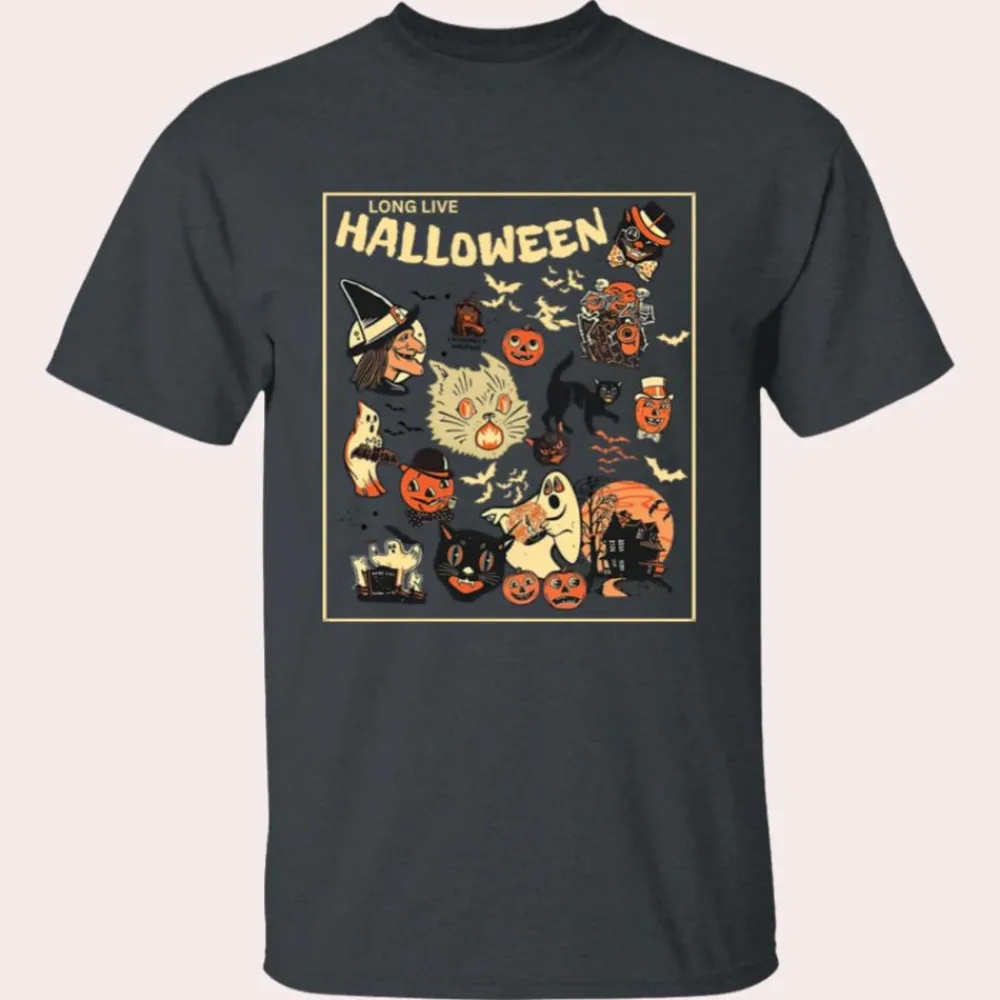 Breng wat Halloween-sfeer in je garderobe met het Jazmina Casual Halloween T-shirt voor dames. Dit shirt heeft een speels, retro-ontwerp met allerlei Halloween-iconen, van ondeugende pompoenen en griezelige geesten tot een charmante zwarte kat. De levendige oranje en crème tinten steken mooi af tegen de donkere grijze stof.