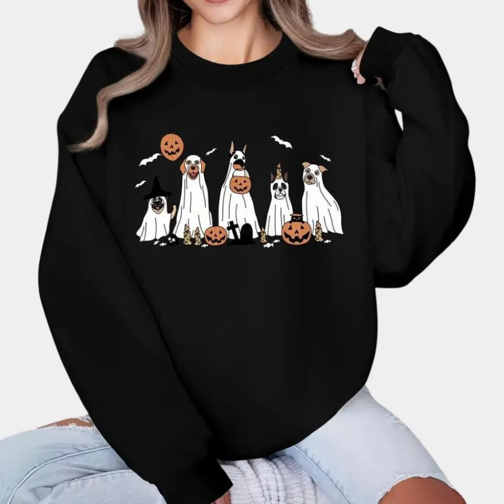 Verwelkom de Halloween-sfeer met de Margareta Damestrui voor Halloween met hondenprint, met een groep schattige honden die verkleed zijn als spoken en heksen. Deze trui is ideaal voor iedereen die van Halloween houdt, en het grappige hondontwerp zorgt gegarandeerd voor een glimlach.