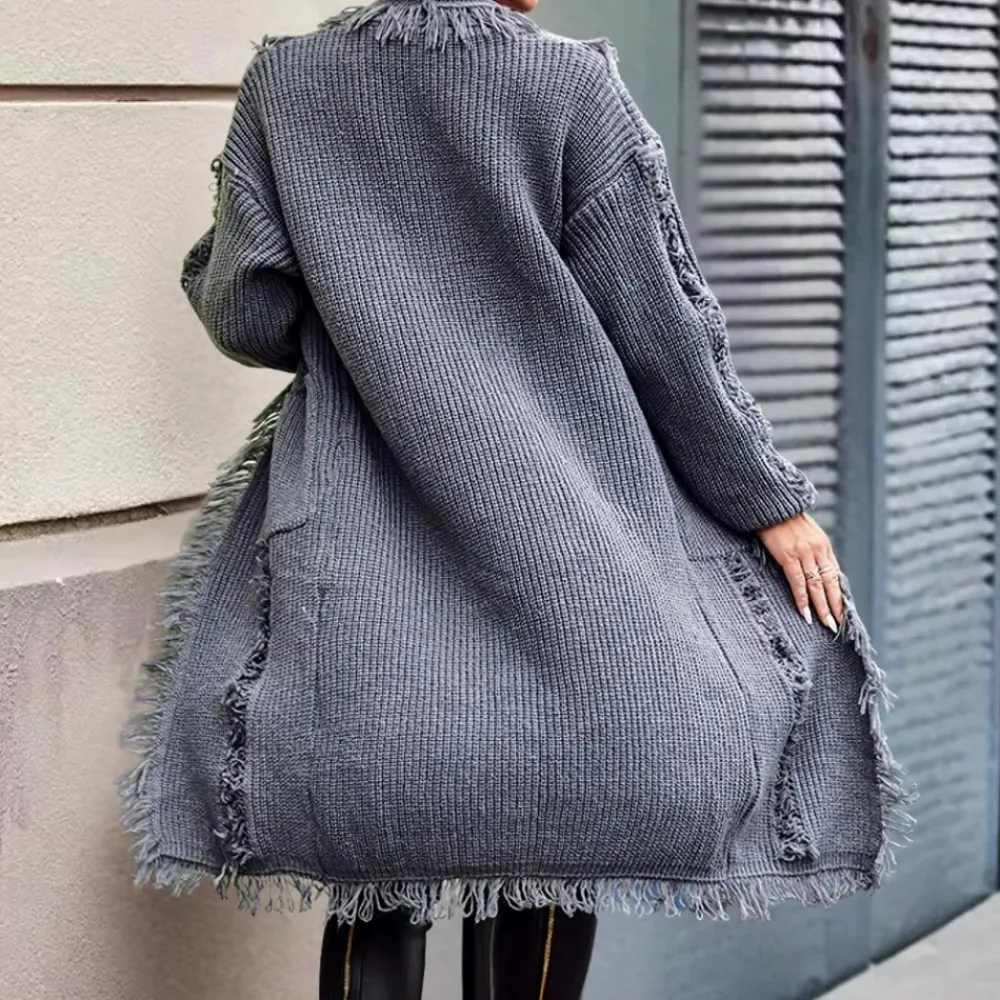 De gebreide stof is heerlijk zacht en biedt je warmte zonder al te zwaar te zijn, waardoor het een uitstekende keuze is voor zowel milde als frisse dagen.