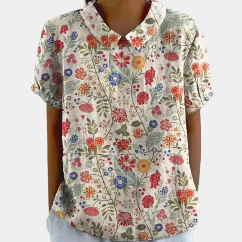 Charmant bloemenpatroon: De Bruna Casual en kleurrijke damesblouse is versierd met een pastoraal bloemenpatroon dat een schattige en vrouwelijke look toevoegt, perfect om je dagelijkse stijl op te fleuren.