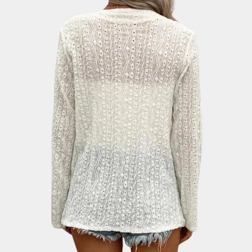 Uitlopende semi-transparante blazer, ideaal voor de lente-en-zomermaanden. Deze lichte blazer is de perfecte aanvulling op je kledingkast voor dit voorjaar. Je kan hem zowel casual dragen als op kantoor.