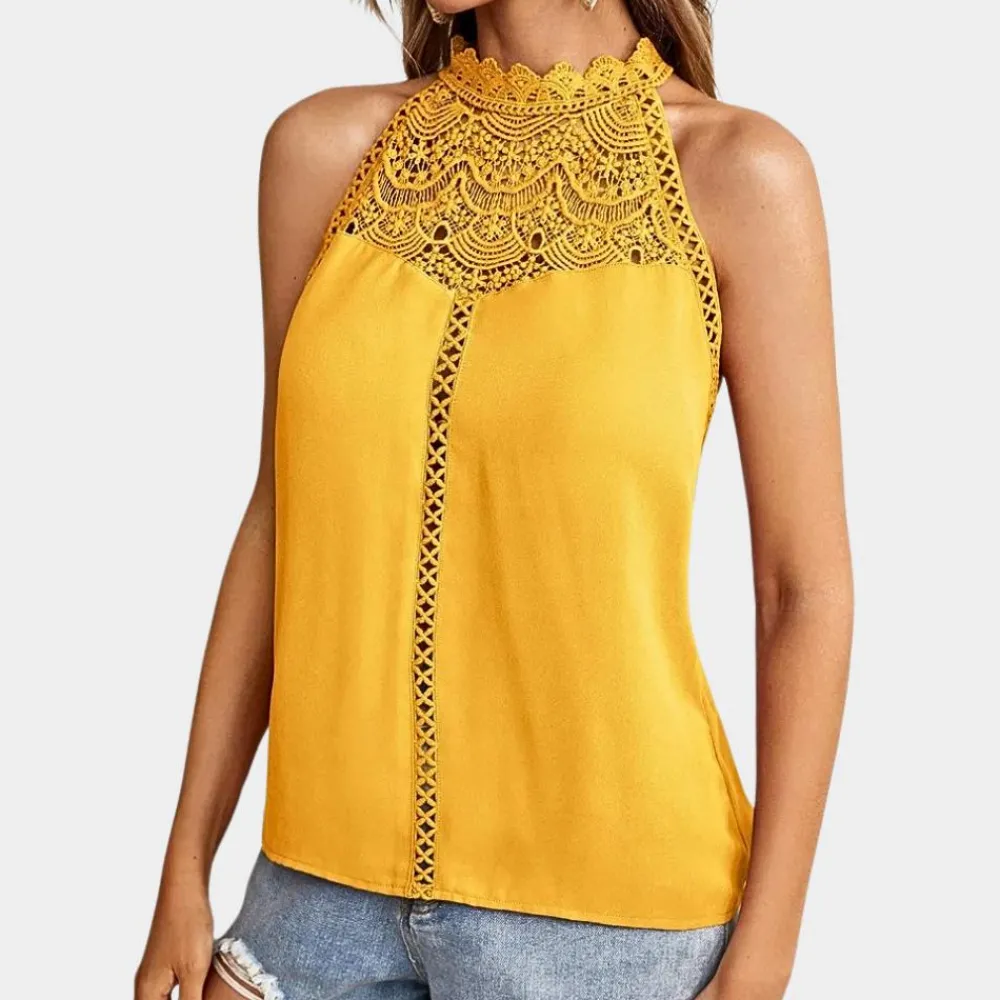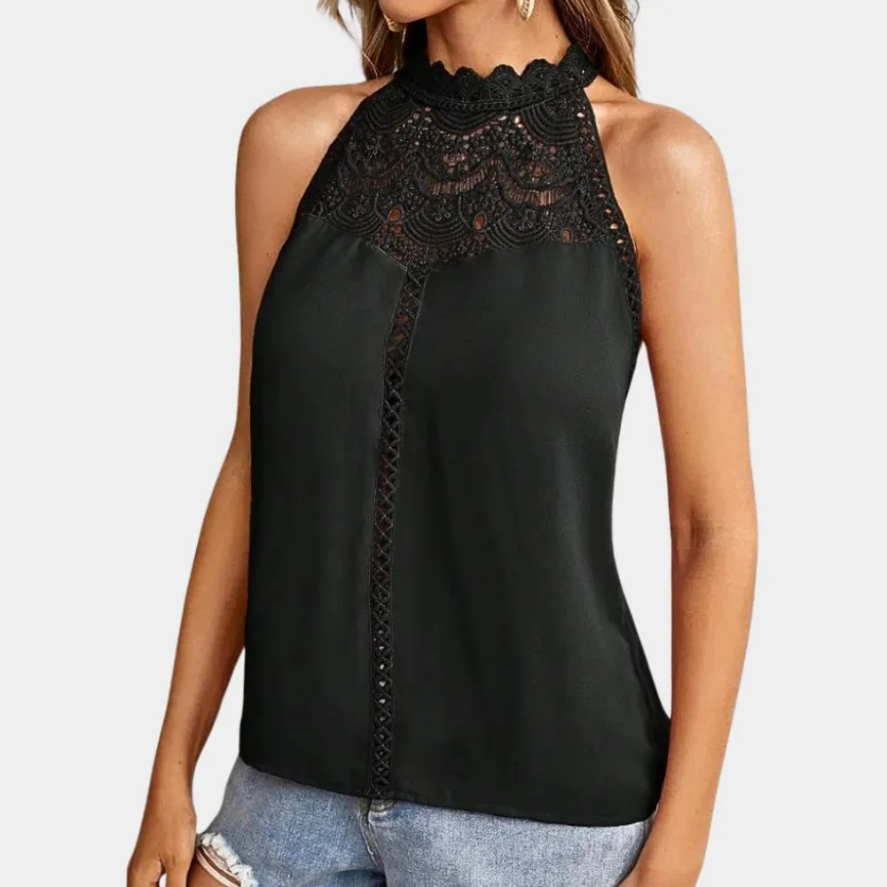 Onze tijdloze kanten blouse met opengewerkt patroon is een must-have voor de lente en zomer. Met delicate kanten details en een mouwloos ontwerp voegt deze blouse elegantie toe aan elke outfit. Combineer hem met verschillende broeken voor verschillende gelegenheden, van brunches tot informele avonden.