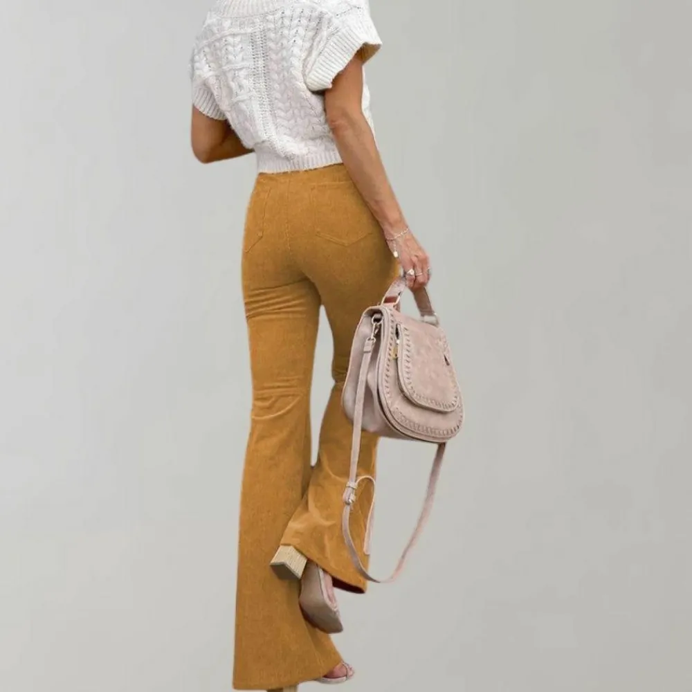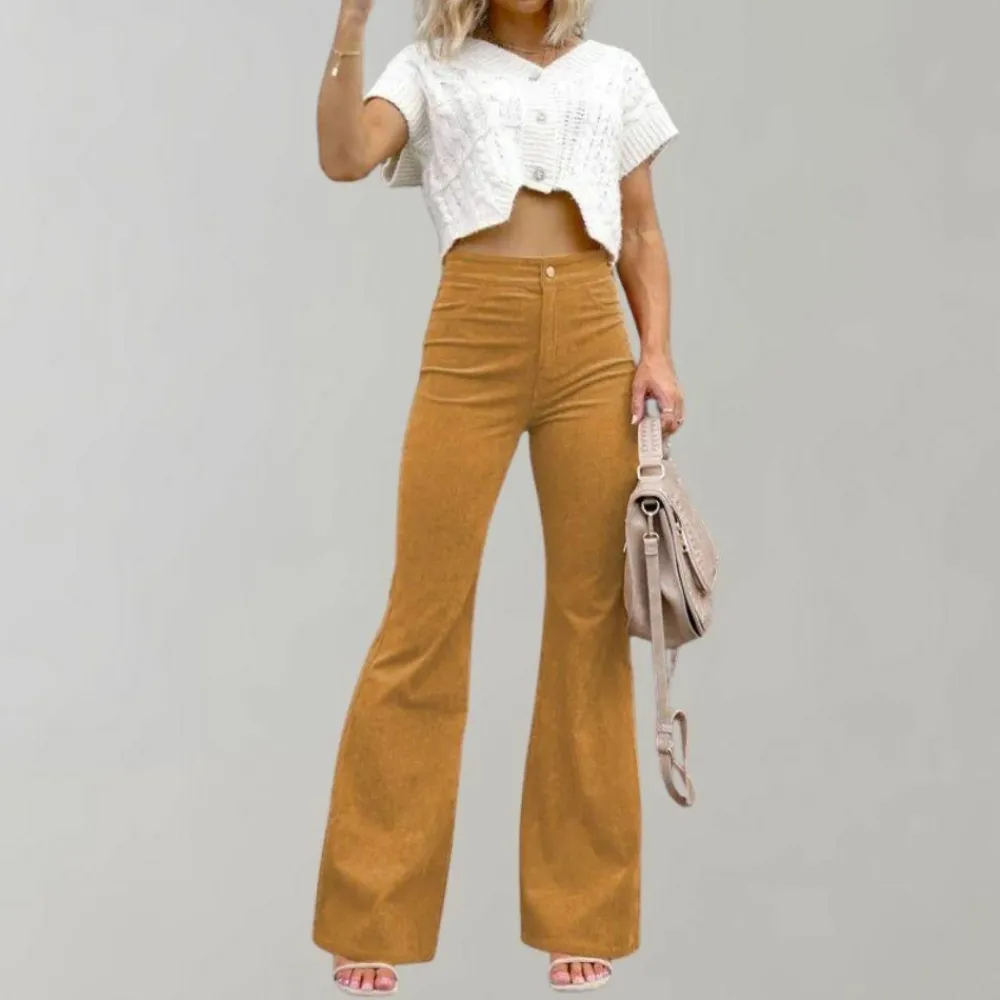 Klaar om je garderobe een stijlboost te geven? Bestel de Abel trendy corduroy uitlopende broek voor dames vandaag nog en voeg dit veelzijdige, comfortabele item toe aan je collectie!