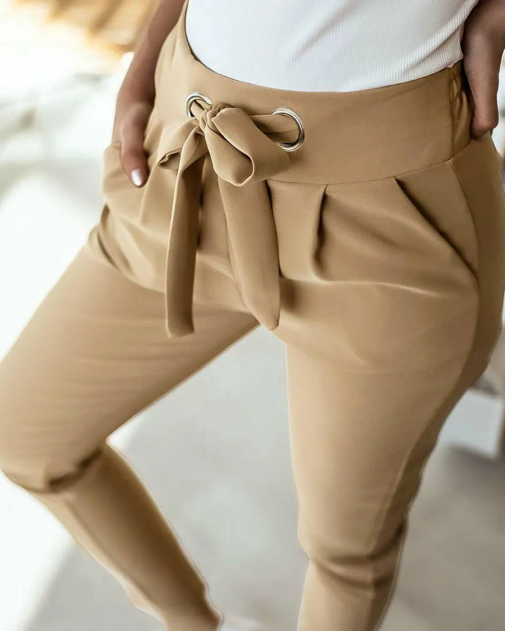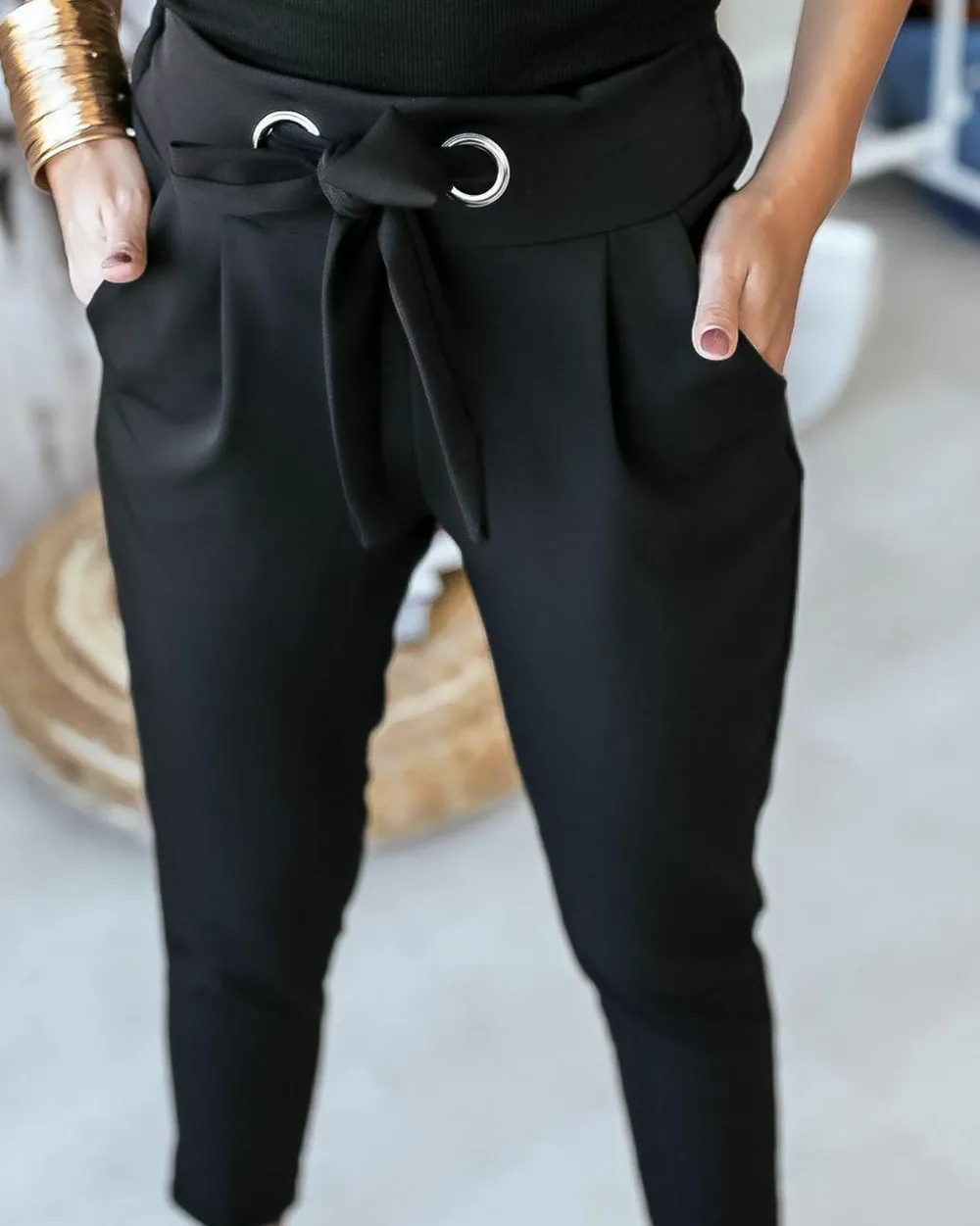 Deze hoge taille broek is perfect voor casual wear of zakelijke kleding. Hij heeft een relaxte pasvorm bij de heupen en dijen, maar toch een afslankend effect bij de buik. De stof is gemaakt van 100% polyester en heeft een elastische tailleband.