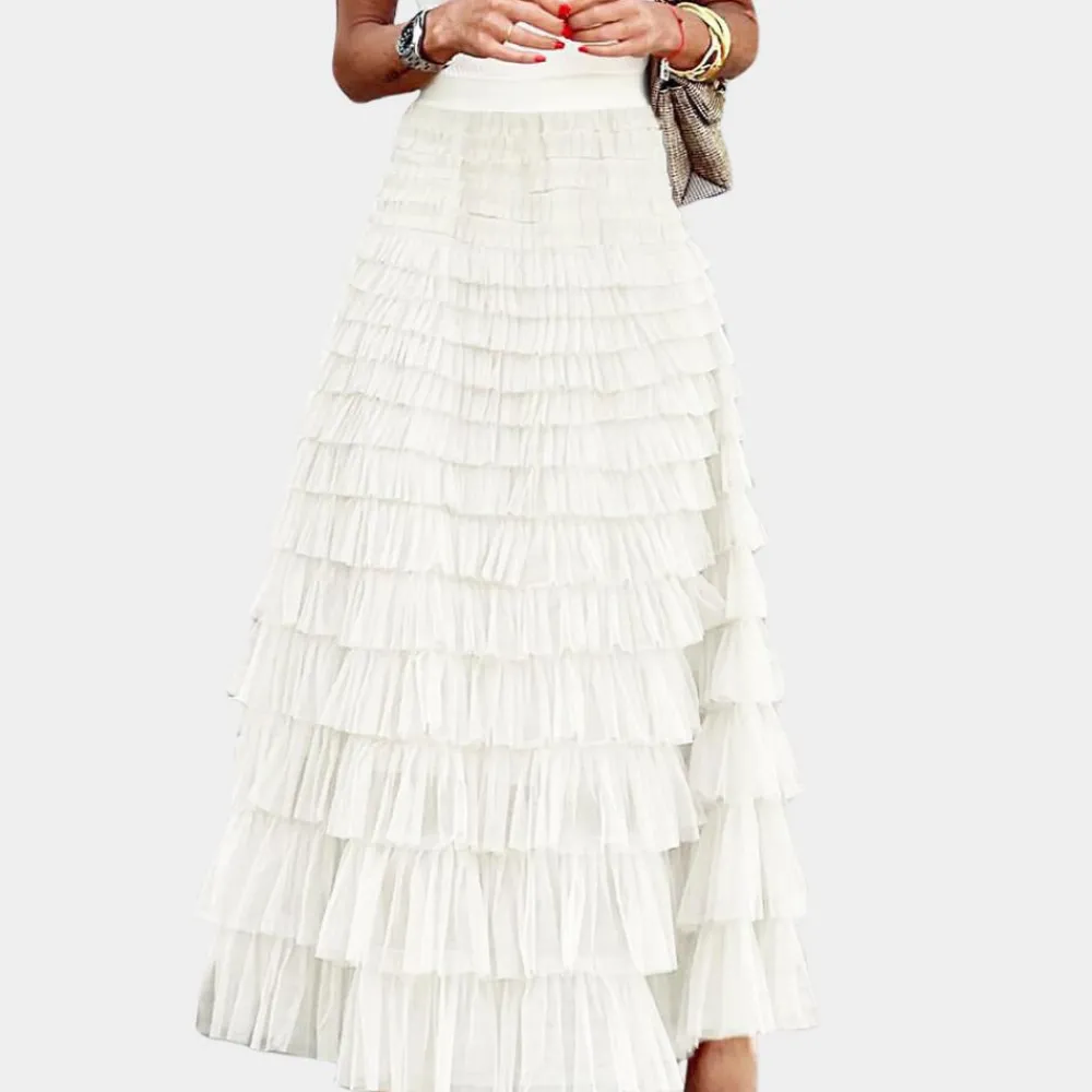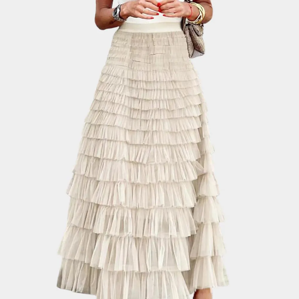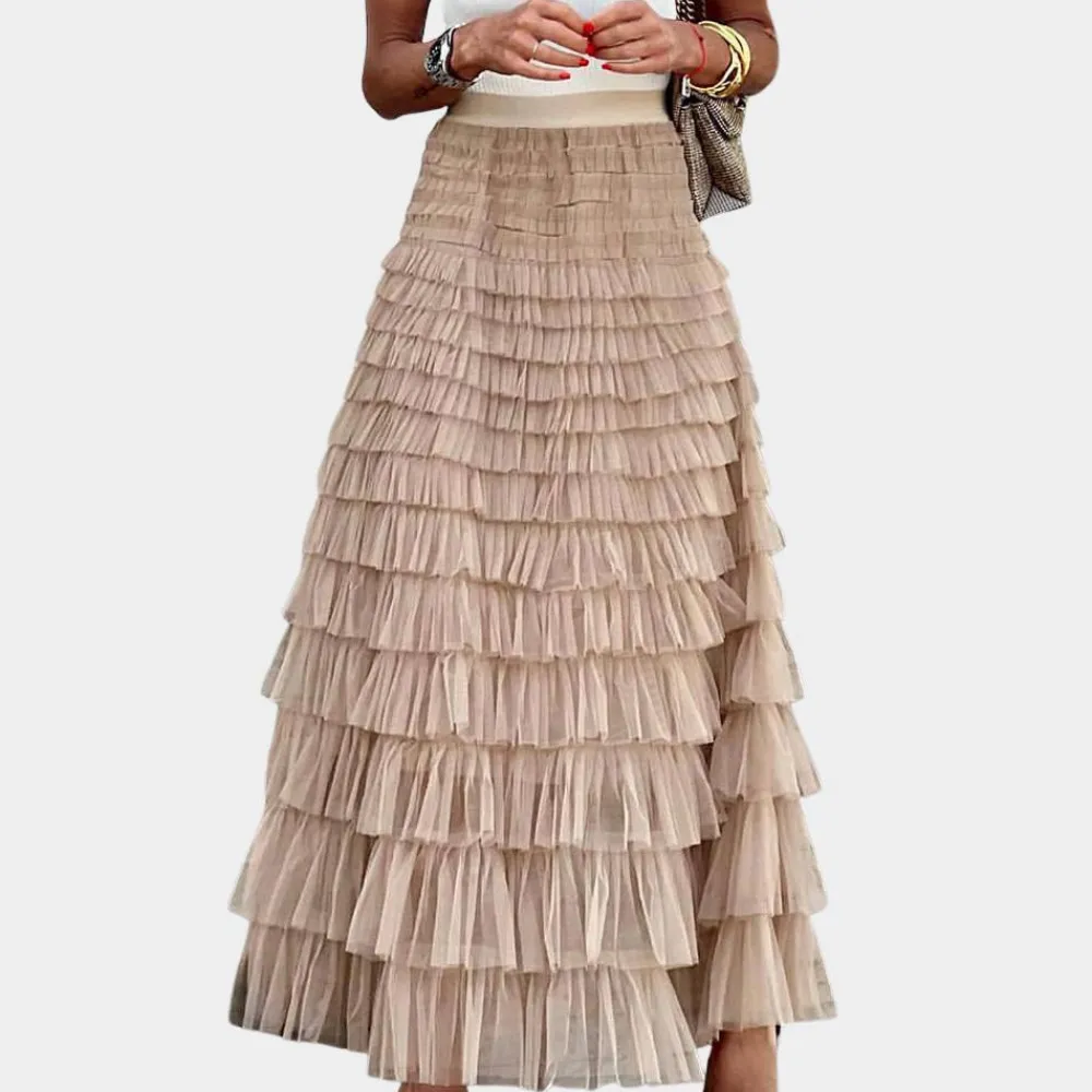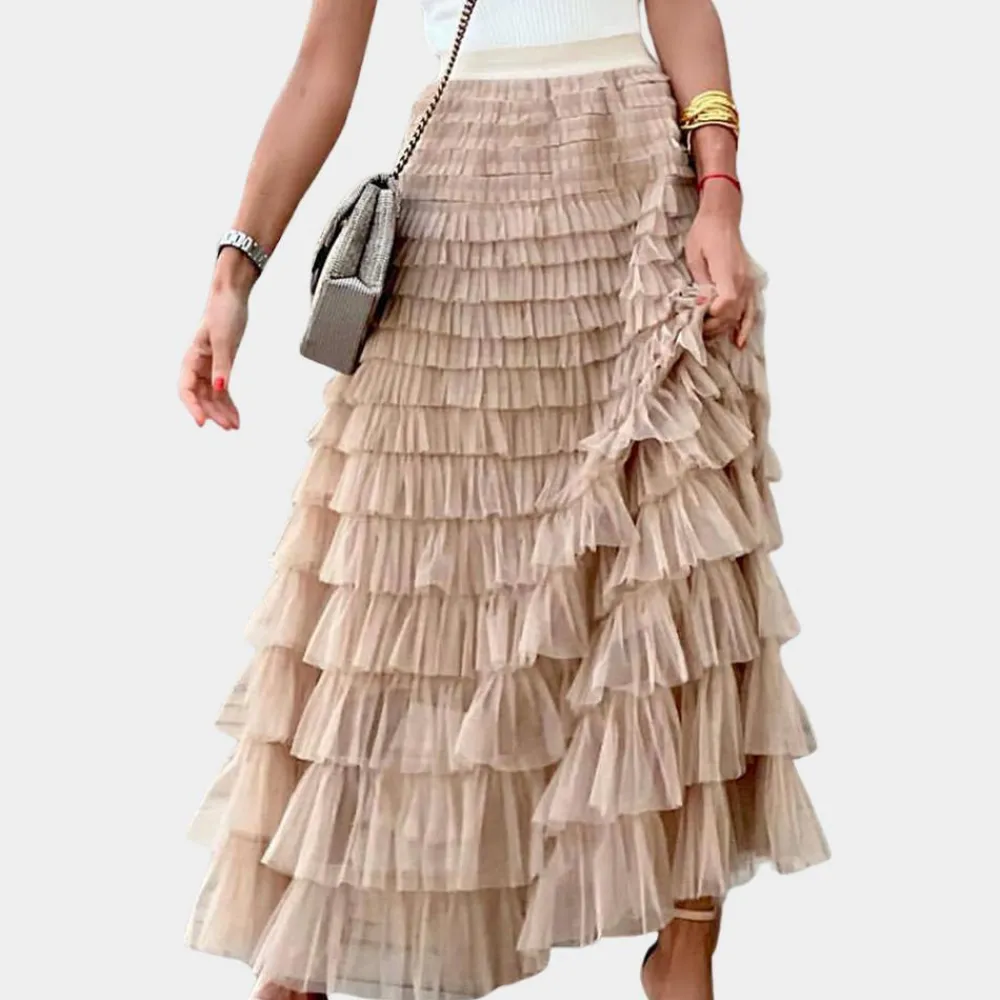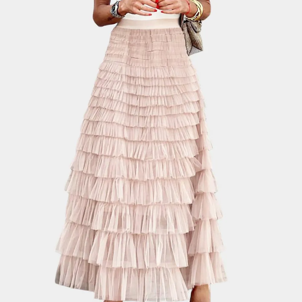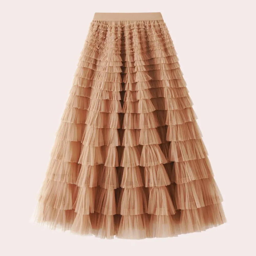 De Shay Stijlvolle damesrok van netstof belichaamt de perfecte mix van elegantie en speelsheid. Met zijn hoge taille en prachtige plooien creëert de rok een betoverende baljurk die er perfect uitziet voor alle gelegenheden. Of je nu een romantische date hebt of een avondje uit met je vrienden, deze rok geeft je outfit een vleugje glamour.