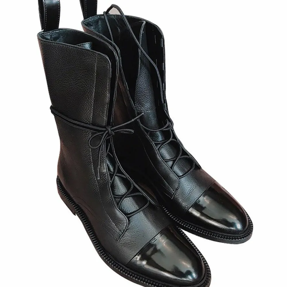 Deze halfhoge laarzen zijn gemaakt van eersteklas leer en hebben een vetersluiting die zowel stijl als functionaliteit biedt. De spitse neus voegt een vleugje elegantie toe, waardoor ze de ideale keuze zijn voor wie houdt van klassieke charme en modern comfort.