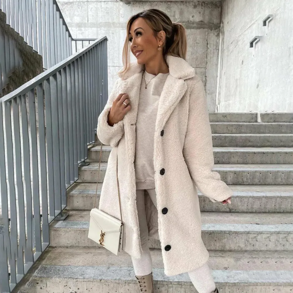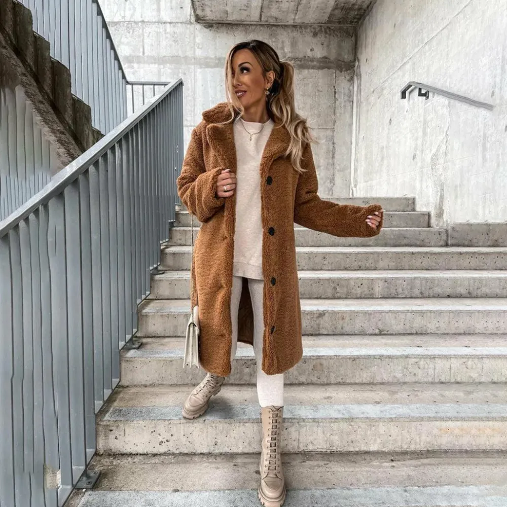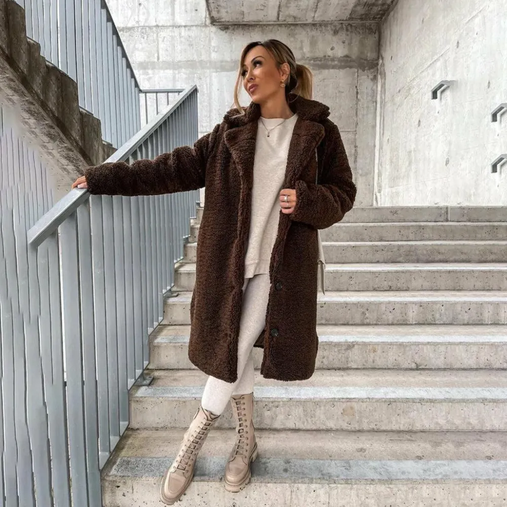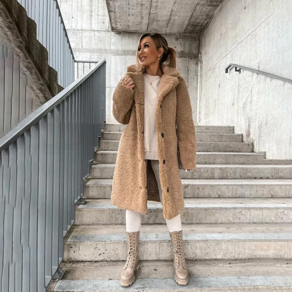 - Stijlvolle Uitstraling: De lange teddy jas straalt niet alleen warmte uit, maar voegt ook een vleugje elegantie toe aan je wintergarderobe.