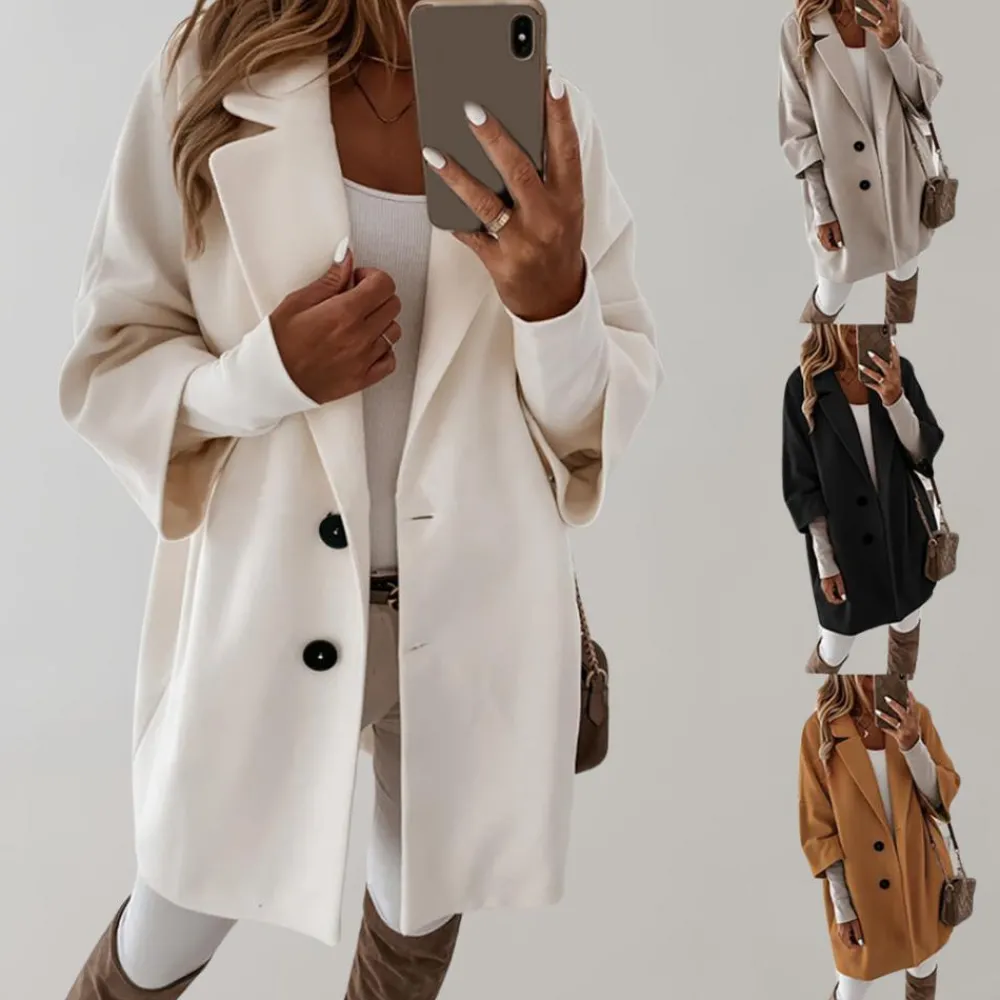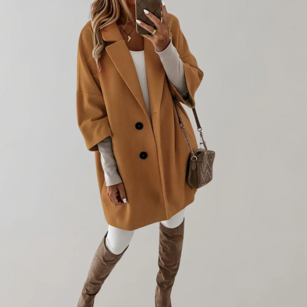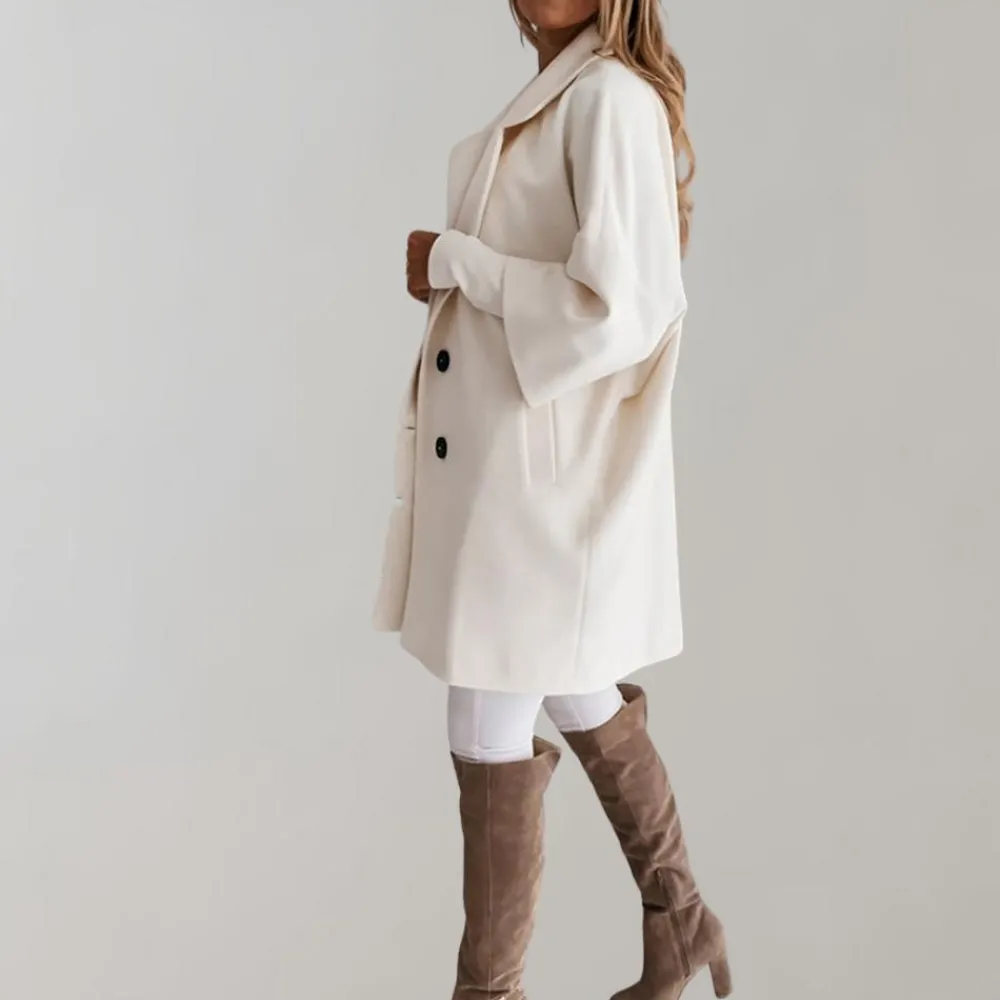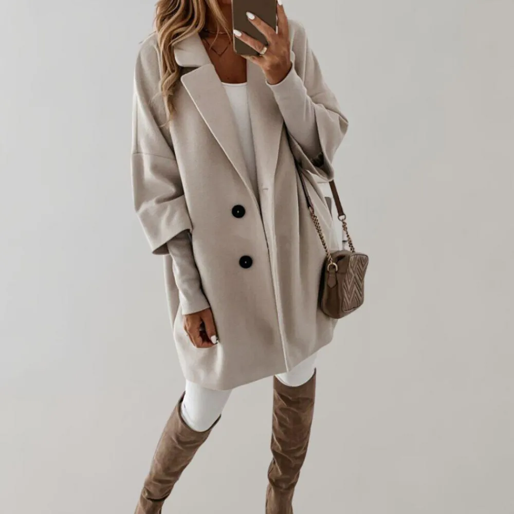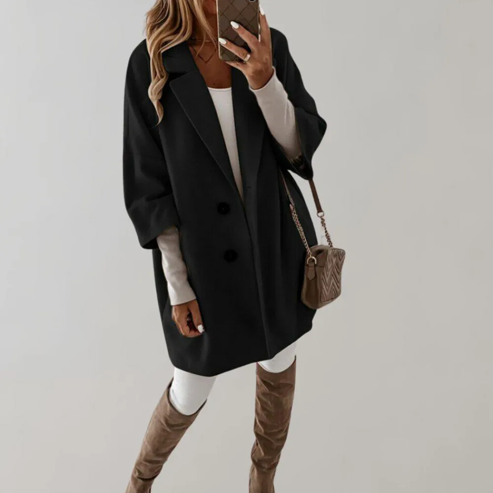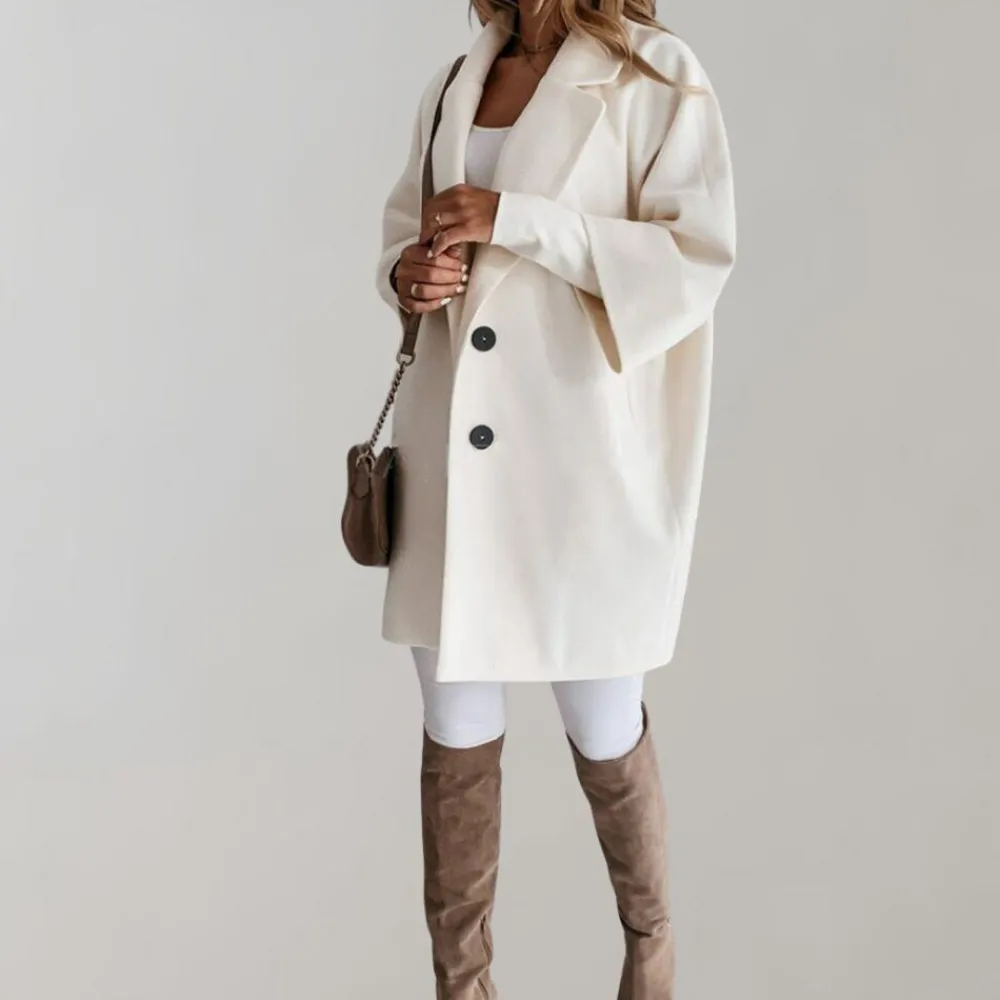 Onze Berenice Elegante jas heeft een ruime vorm, accentueert je rondingen en creëert een vrouwelijke en verfijnde look.