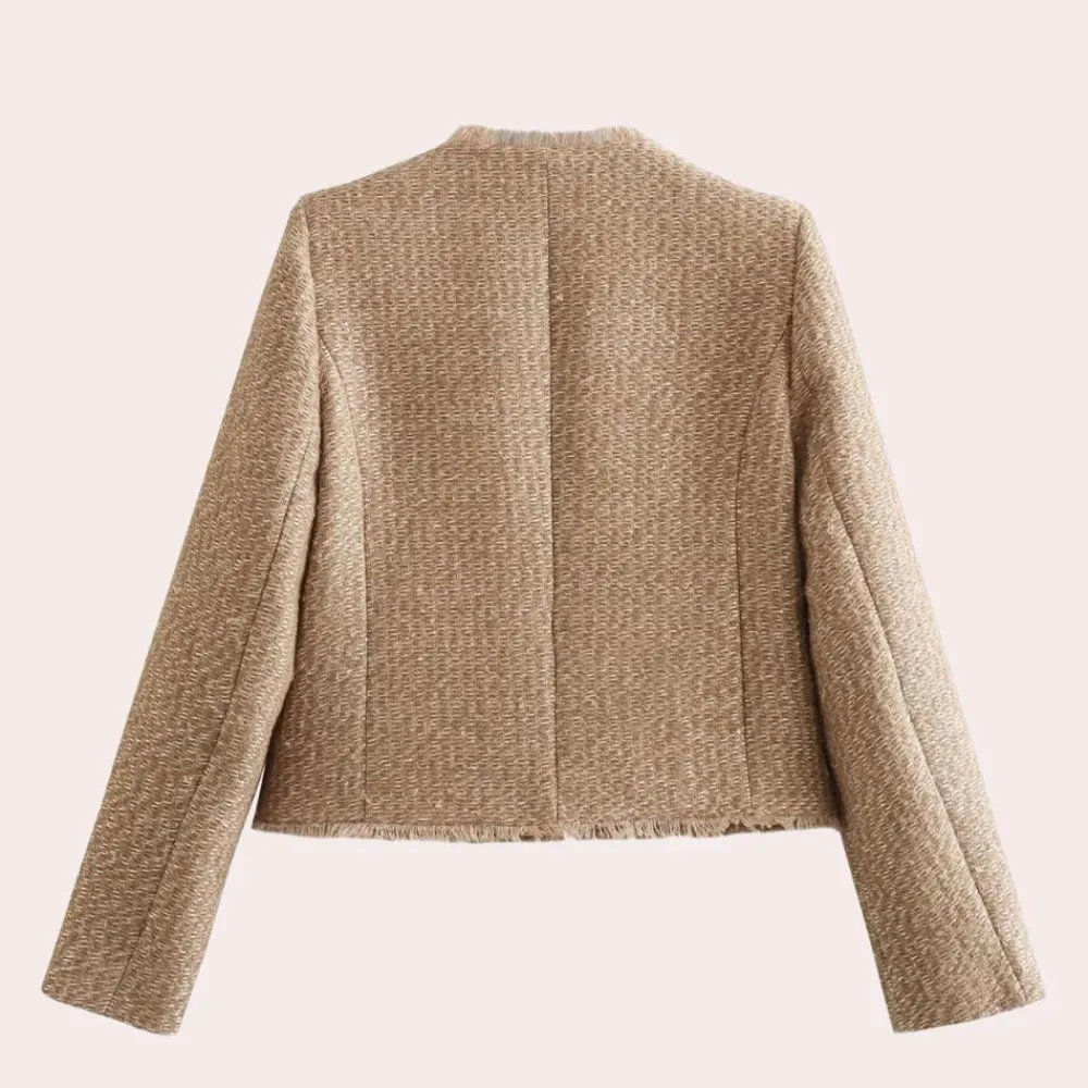 Dit jasje is gemaakt van hoogwaardig tweedmateriaal en belichaamt de perfecte combinatie van duurzaamheid en luxe. De subtiel gevlekte textuur voegt diepte toe aan elke outfit, terwijl de zorgvuldig vervaardigde details, zoals de gestructureerde kraag en knoopsluiting, een vleugje verfijning toevoegen.