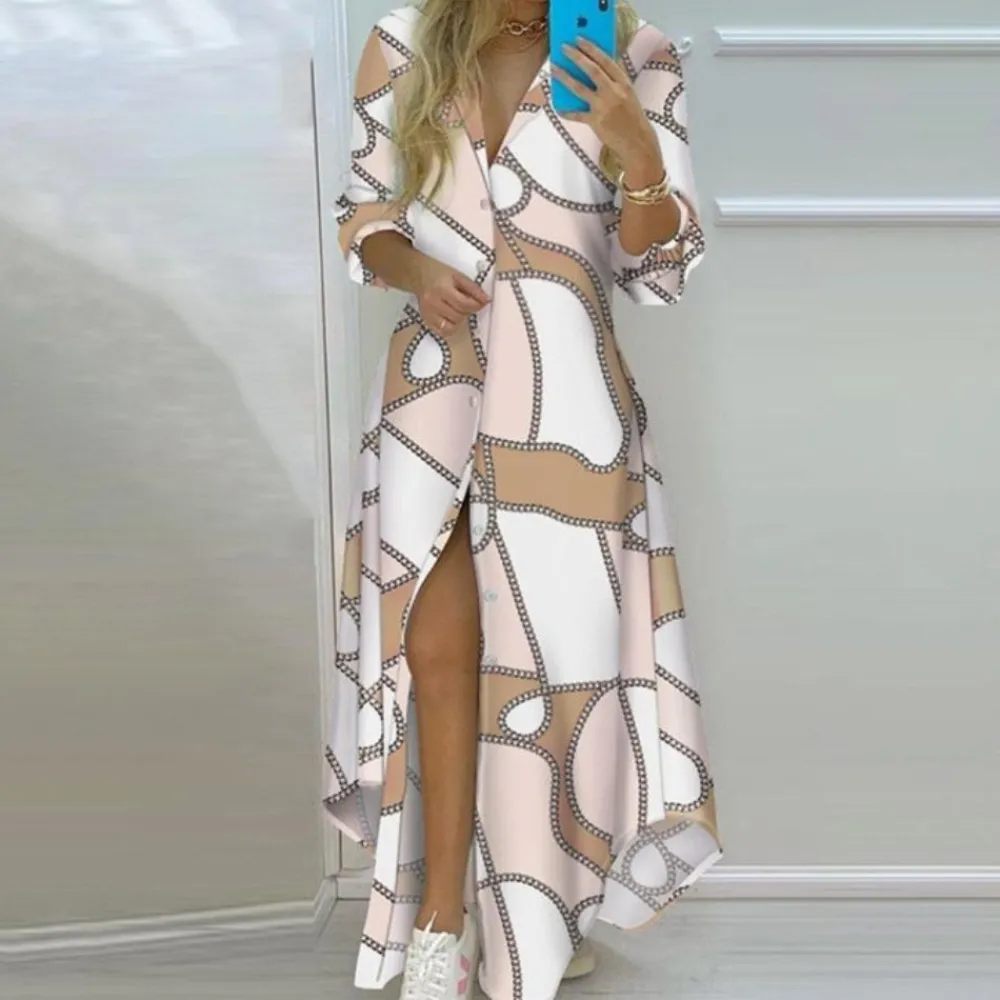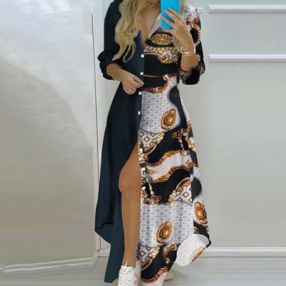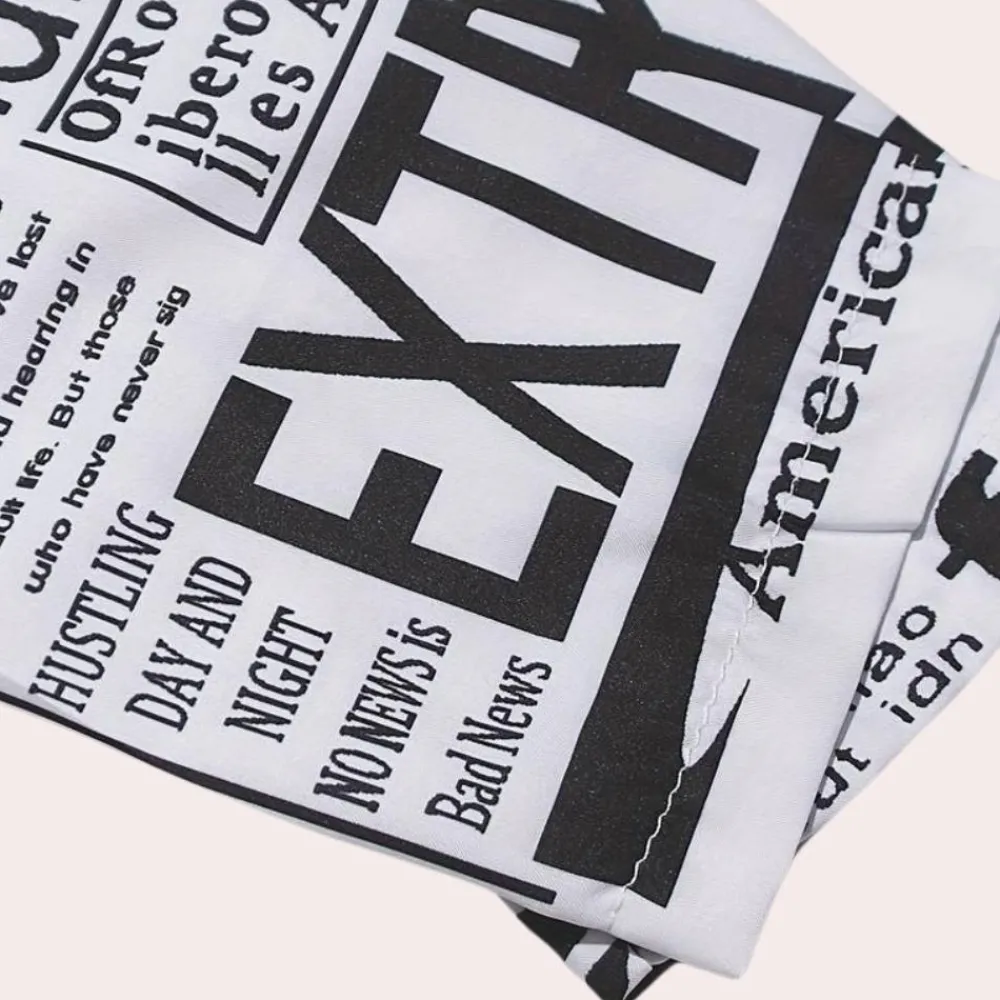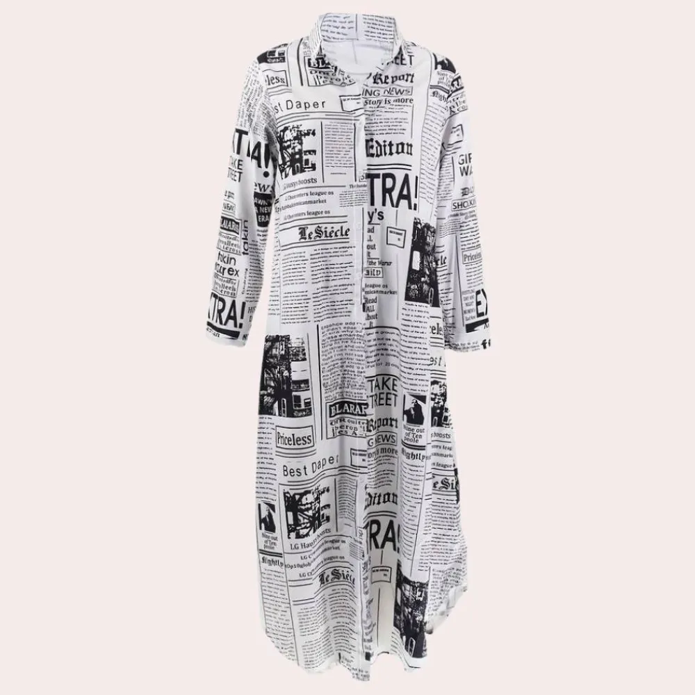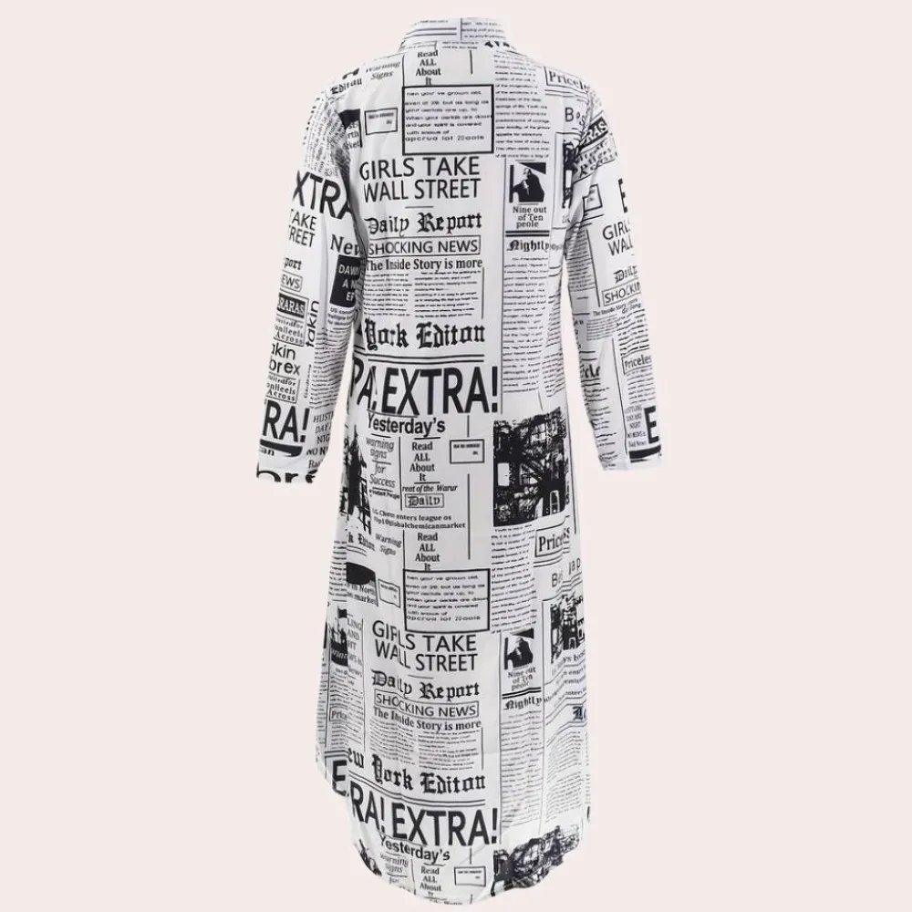 Maak kennis met de Antonia Luxe Jurk met Artistieke Kranten Print– een trendy en unieke creatie die perfect is om een statement te maken.
