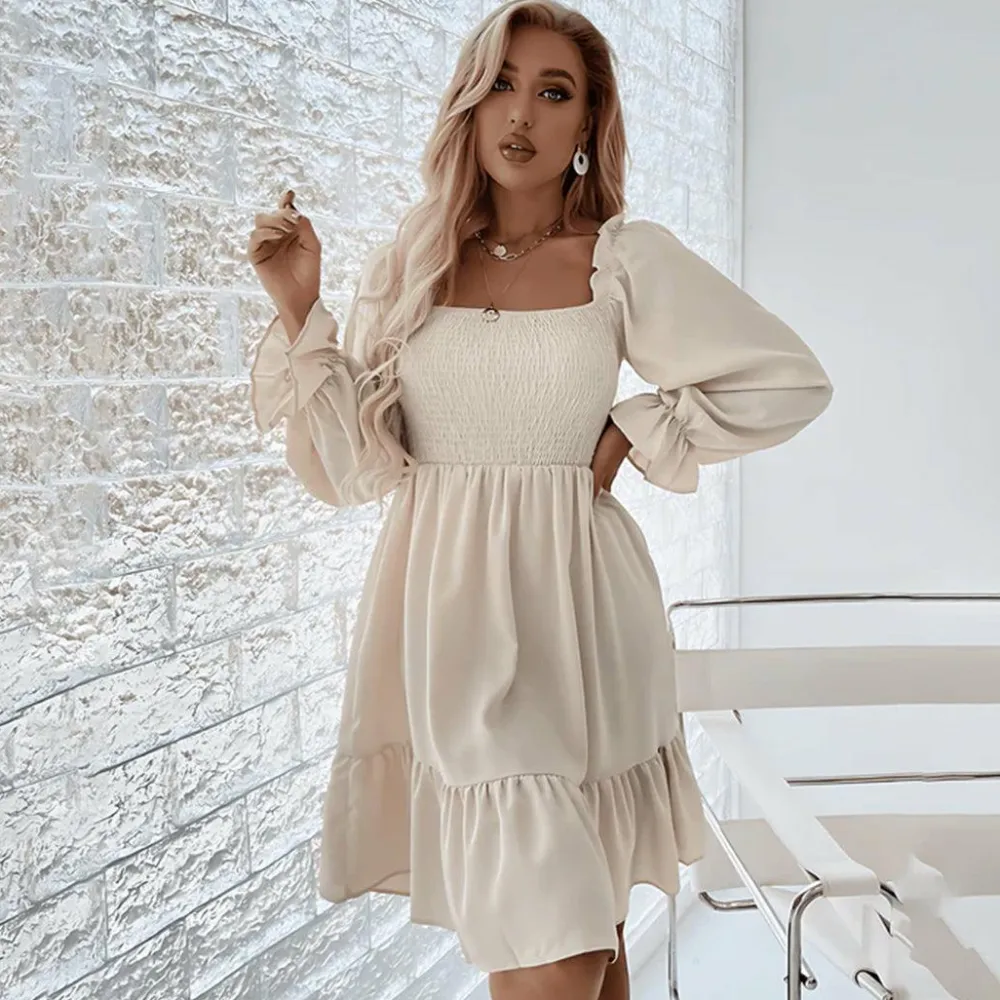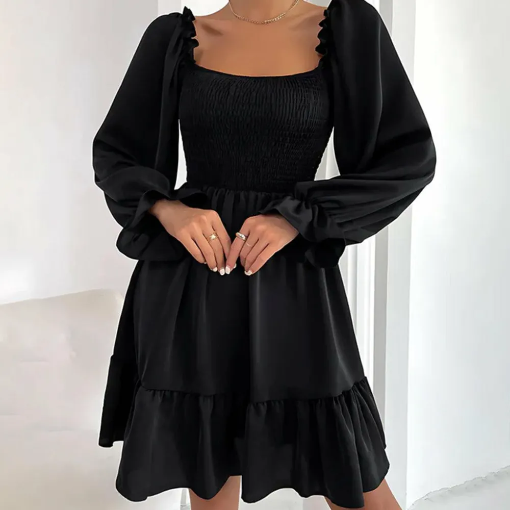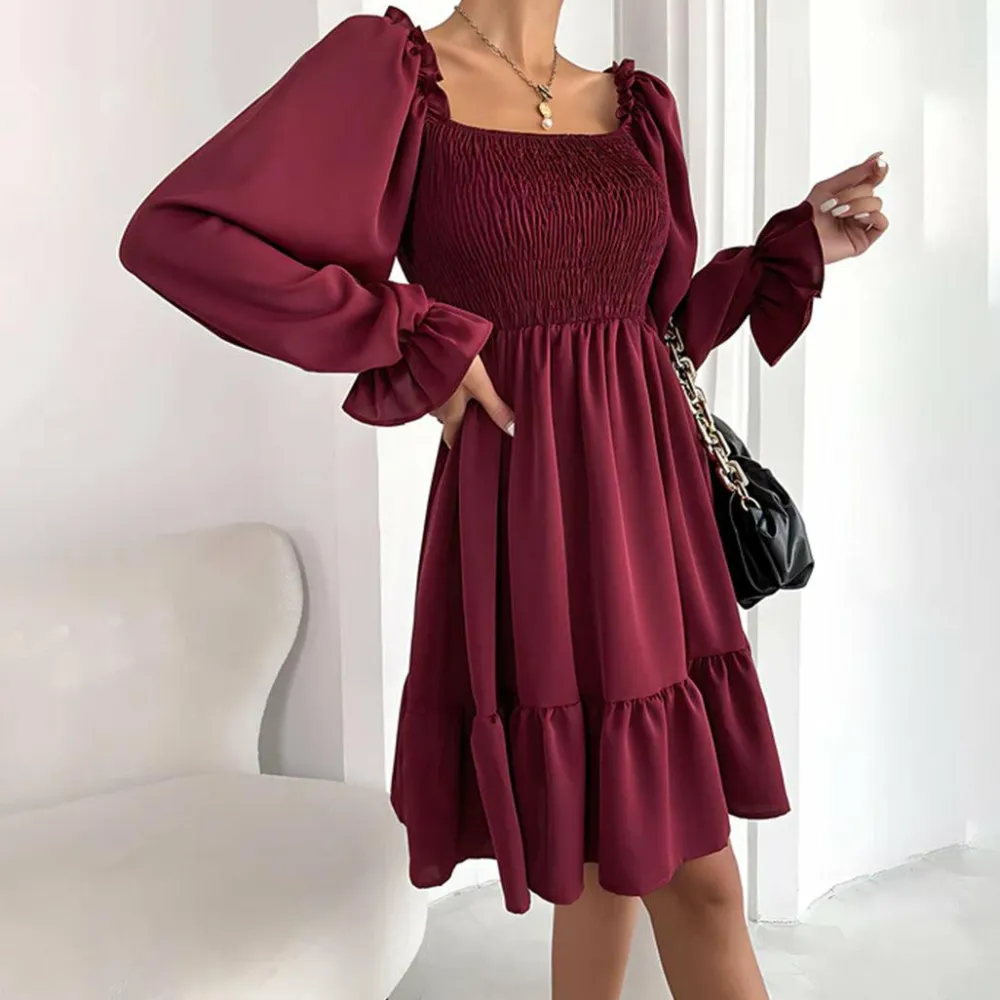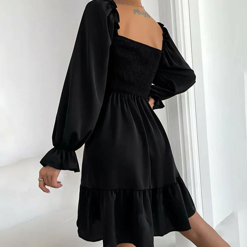 De vierkante diepe halslijn voegt een vleugje verfijning toe, terwijl de lengte boven de knie een flirterige en jeugdige look geeft. De lange mouwen met ruches rond de polsen voegen een vleugje speelsheid en elegantie toe. De aansluitende bovenkant van de jurk benadrukt je rondingen, terwijl de losse en zwierige onderkant zorgt voor bewegingsvrijheid. Of je nu een dagelijkse gelegenheid bijwoont of een romantisch diner hebt, met deze jurk zie je er moeiteloos stijlvol uit en straal je vrouwelijke allure uit.