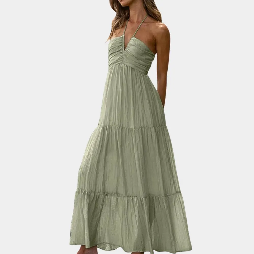 Ervaar moeiteloze bohemian chic met onze Dagmar Lange jurk met halternek. De jurk is gemaakt van een lichte, vloeiende stof, heeft een halternek en een volle maxirok voor een luchtige, comfortabele pasvorm. Hij is perfect voor elke gelegenheid en kan omhoog of omlaag gekleed worden. Omarm je vrije geest en stijl met onze Dagmar Lange jurk met halternek