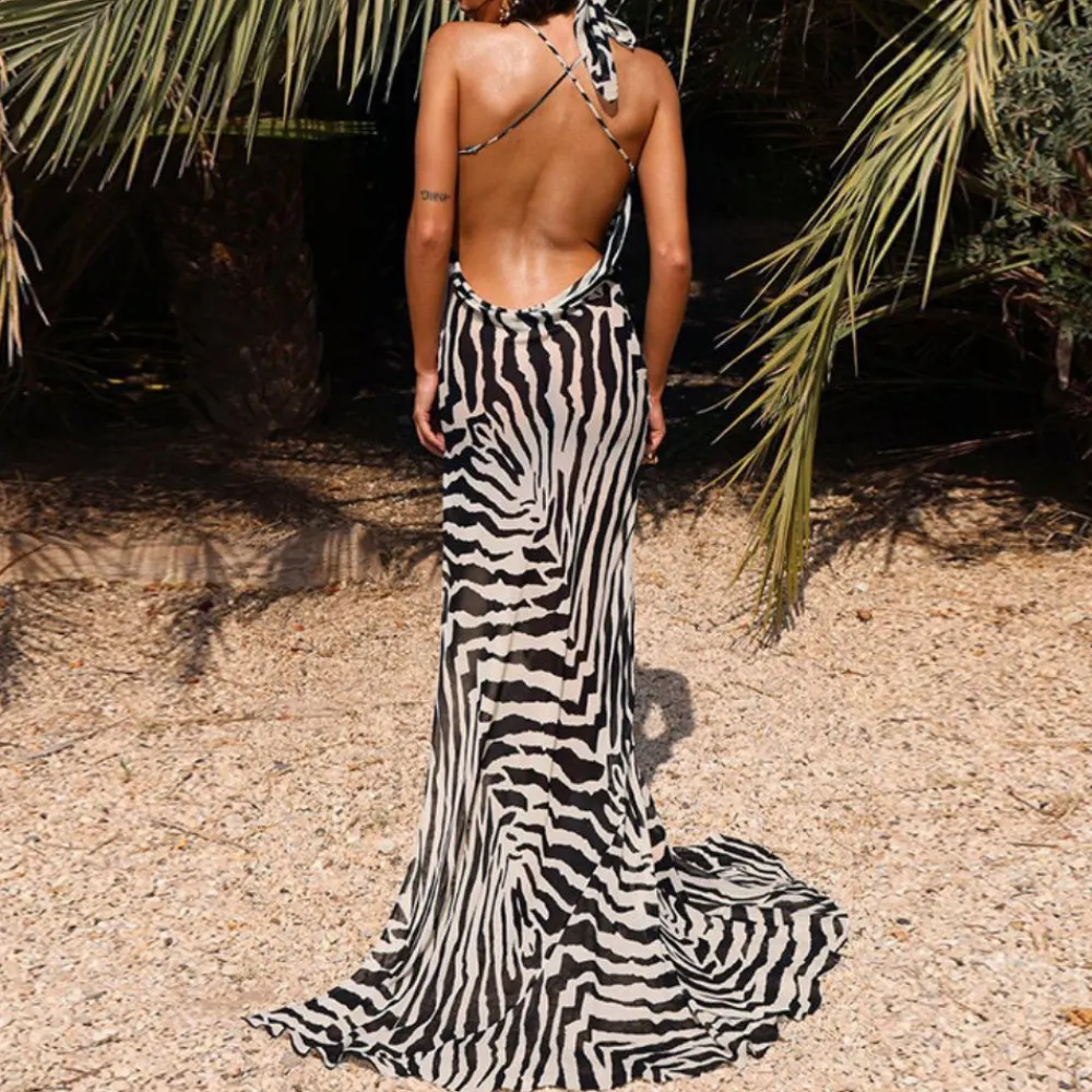 Ervaar de betovering van onze adembenemende avondjurk, ontworpen om je natuurlijke charme te accentueren. De vloeiende snit en het opvallende zebrapatroon stralen tijdloze klasse uit en zorgen ervoor dat je schittert tijdens galadiners of romantische uitjes.