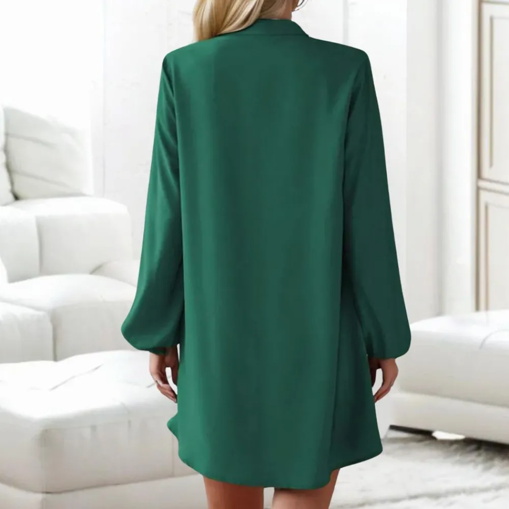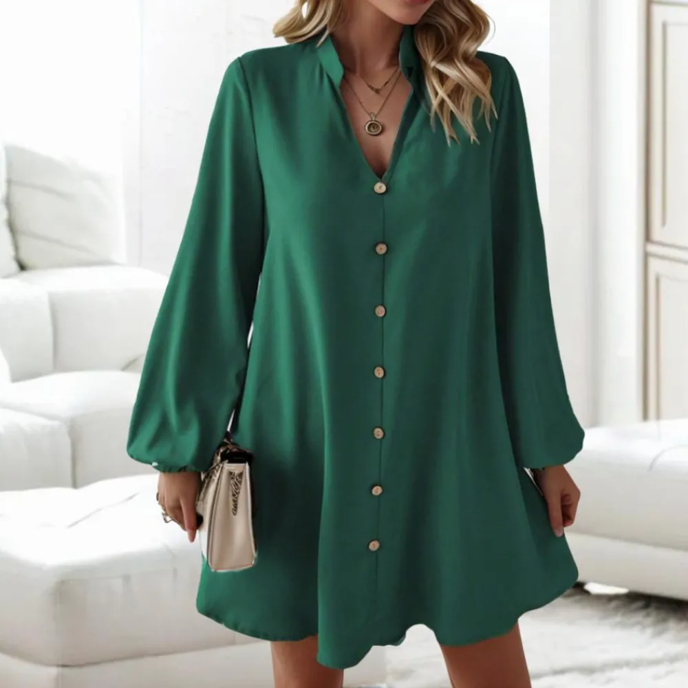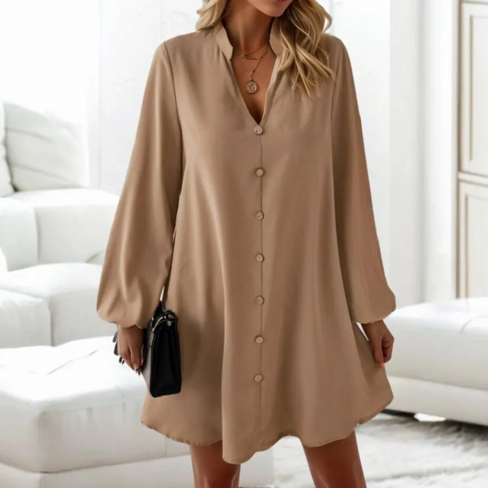 Verhoog je seizoensstijl moeiteloos met onze effen jurk met V-hals die staat voor ingetogen elegantie.