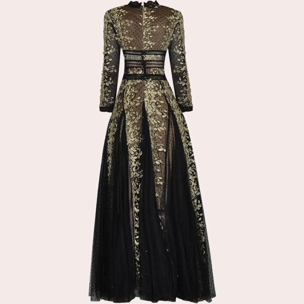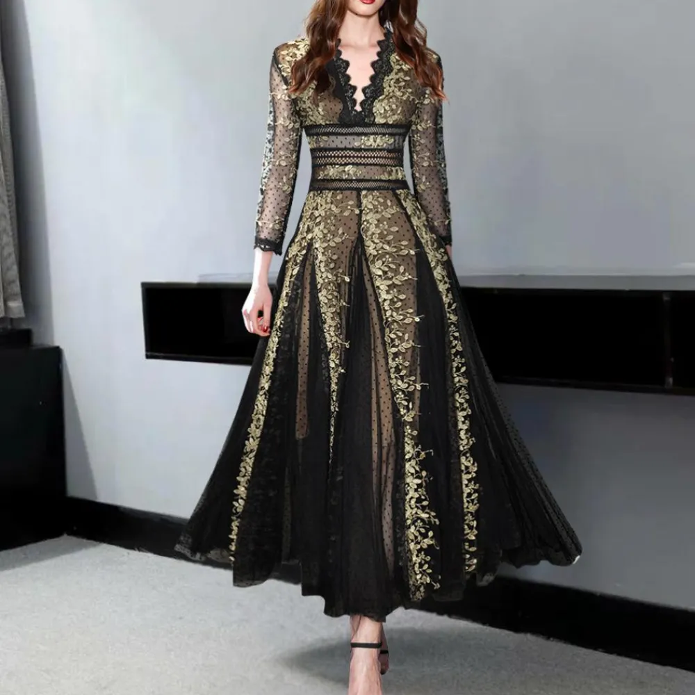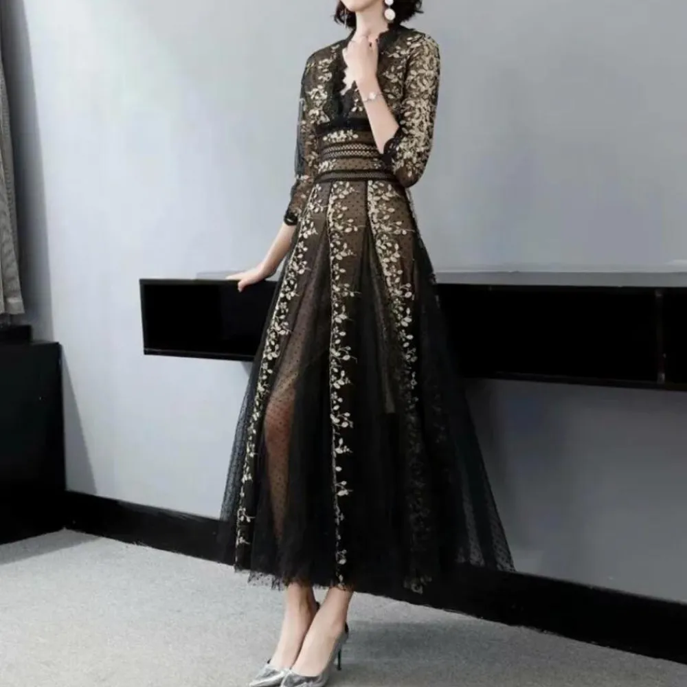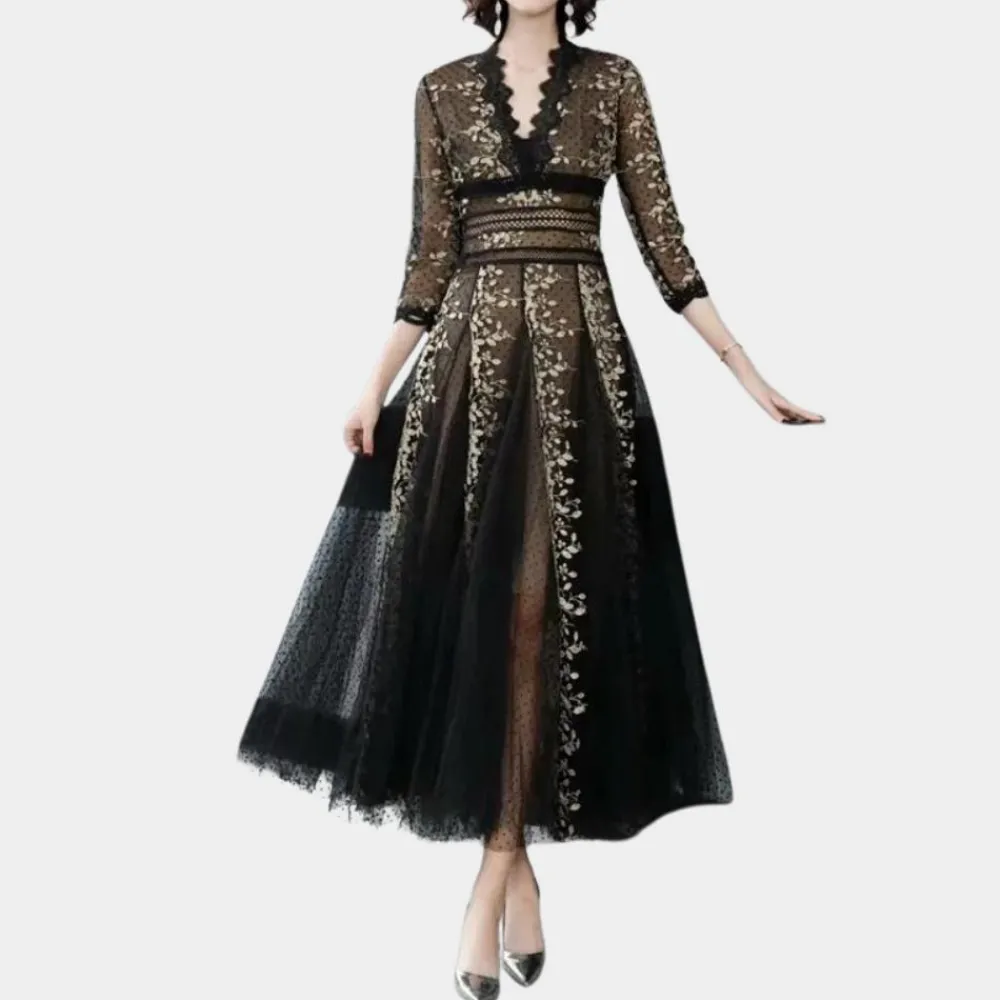 Verlies jezelf in de verfijning van het flatterende silhouet en geniet van de luxe van hoogwaardige stoffen. Verhoog moeiteloos je stijl met Eleanora – een elegante kanten jurk met v-hals voor dames.