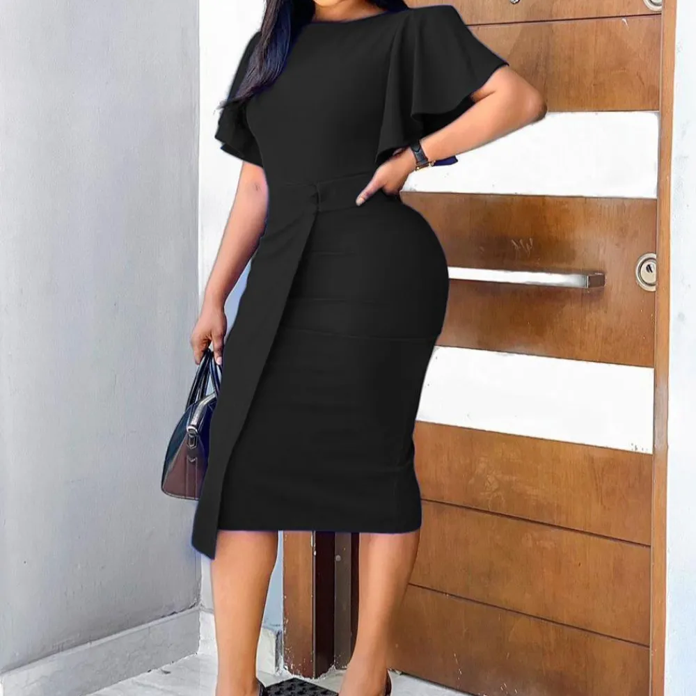 Trek de aandacht op de werkplek met de elegante plus-size splitrokjurk, een zorgvuldig ontworpen kledingstuk dat stijl en zakelijke verfijning naadloos combineert.