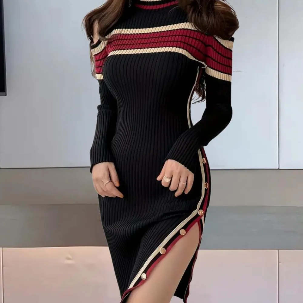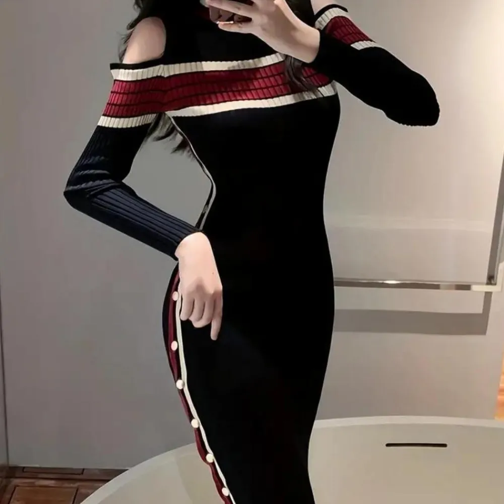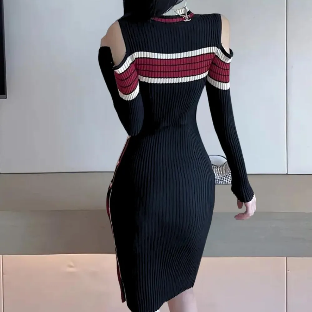 Deze moderne jurk heeft een verfijnd ontwerp met blote schouders, wat een edgy touch aan je outfit toevoegt en tegelijkertijd je silhouet elegant accentueert. Gemaakt van zachte, rekbare stof, biedt deze jurk zowel warmte als flexibiliteit, waardoor het perfect is voor jaarrond gebruik.