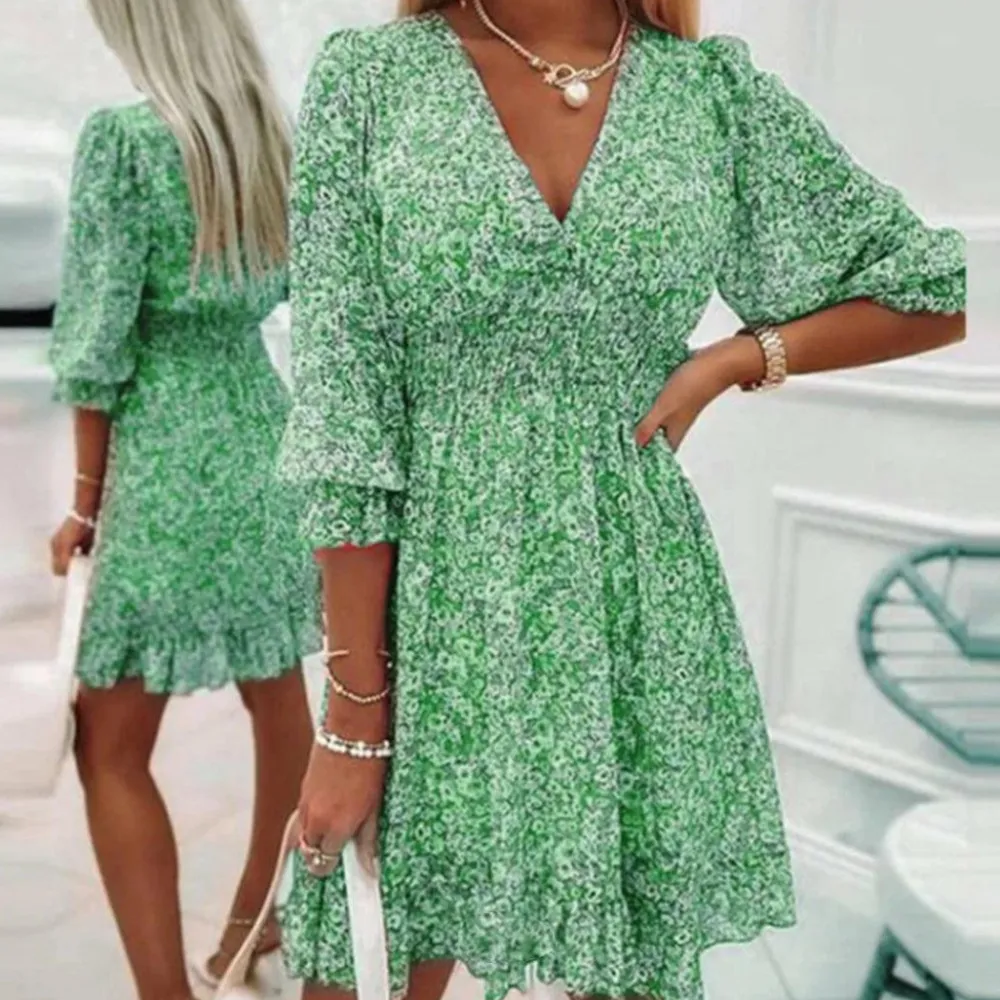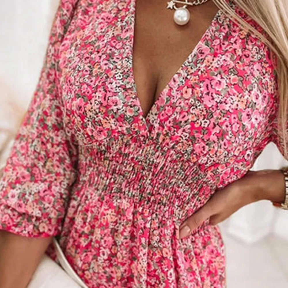 De JANNINE midi zomerjurk voor dames met korte mouwen en een v-hals is precies wat je nodig hebt. Verkrijgbaar in de kleuren roze, blauw en groen, is deze voor dames de perfecte aanvulling op je zomergarderobe.