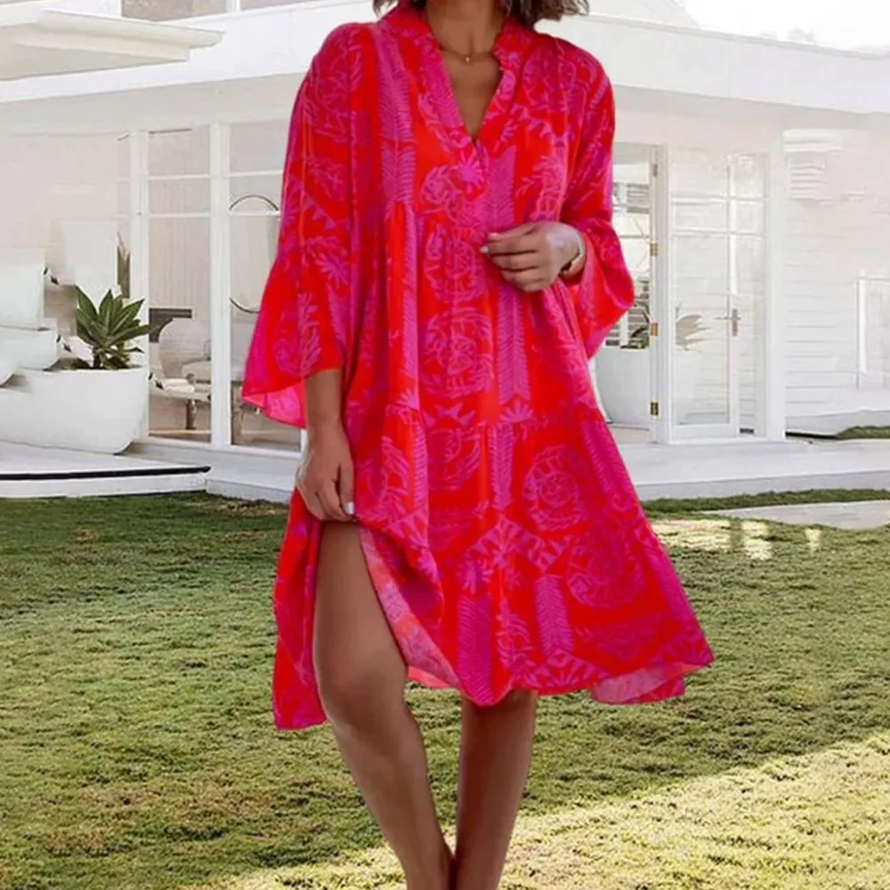 De mooie mix van geometrische en bloemenprints geeft de jurk een unieke uitstraling, terwijl de V-hals en 3/4-mouwen een elegante touch toevoegen. De jurk is gemaakt van hoogwaardige polyester stof, waardoor hij zacht en comfortabel aanvoelt.