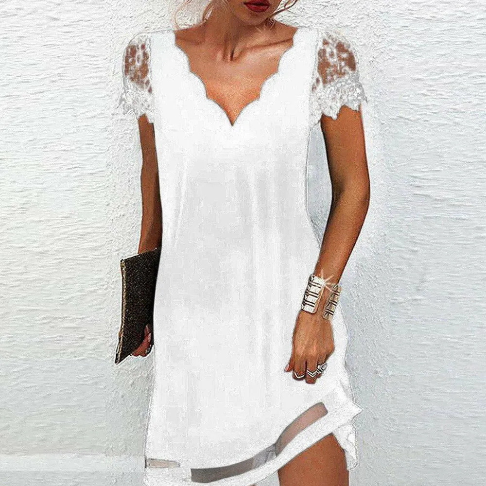 Dit vierkante jurkje is een must-have voor je garderobe. Met zijn vierkante halslijn en korte, transparante mouwen straalt het een tijdloze charme uit die moeiteloos overgaat van dag naar nacht. Het gelaagde kant met contrasterende afwerking voegt een vleugje vrouwelijkheid toe en tilt je stijl naar een nieuw niveau.